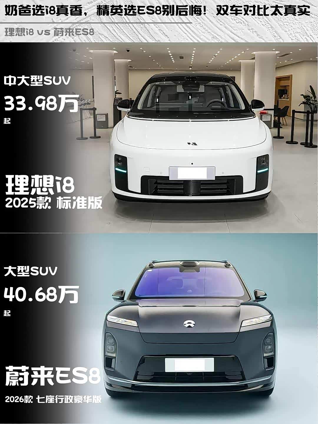 最近在选车的小伙伴看过来!🚗 今天给大家深度对比两款热门纯电SUV——理想i8 2025款标准版和 蔚来ES8(参数|询价) 2026款七座行政豪华版,都是30-40万价位段的实力选手,但性格截然不同!💡