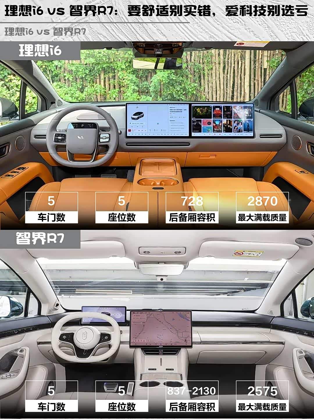 i6的3米轴距后排能跷二郎腿,728L后备箱+前备箱装露营装备无压力⛺️ 智界R7后备箱扩展容积2130L更夸张,但溜背造型牺牲了些后排头部空间。i6的七层座椅填充像大沙发,R7零重力座椅18向调节更适合长途。