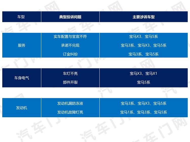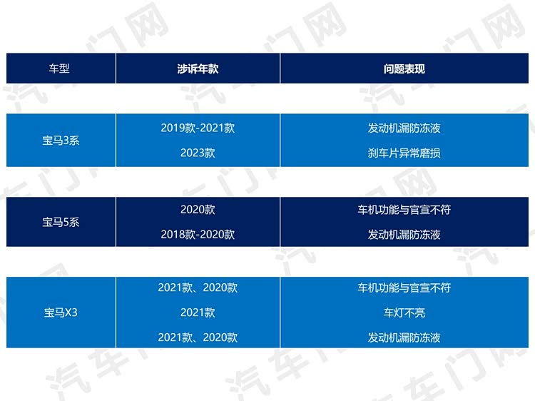 从涉诉车型的具体投诉问题看,华晨宝马的主要投诉来自宝马 3系、宝马(参数|询价)5系和宝马X3三大投诉点。已经持续几年的车机功能减配、发动机漏防冻液依然在招致老车主的不满。另外也要看到,权益和维保承诺不兑现、不退订金等问题也进一步暴露出宝马终端经销商的经营和管理现状有待改善。