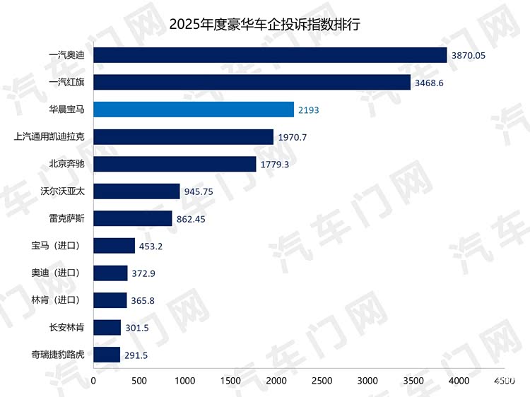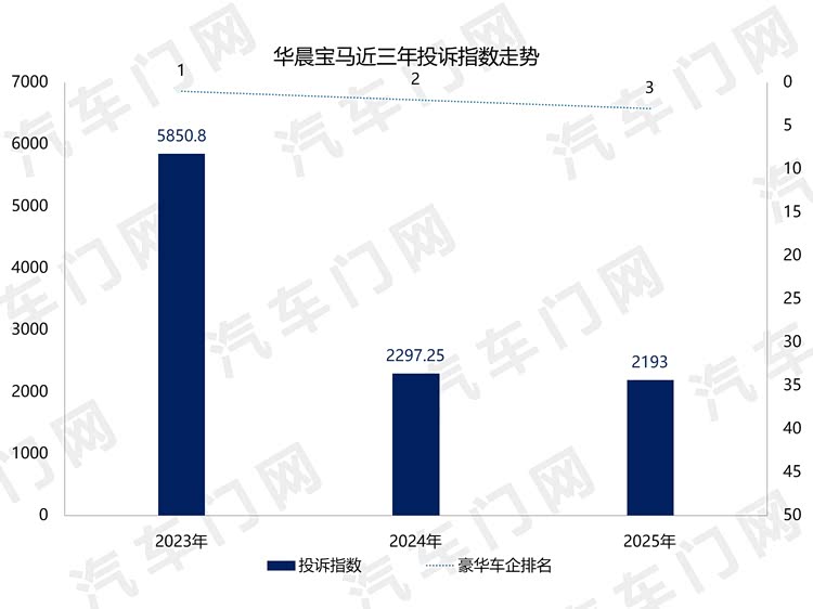 2025年,华晨宝马的投诉指数达到了2193,排在传统豪华车企投诉榜第三位,仍然处于一汽奥迪和北京奔驰之间。