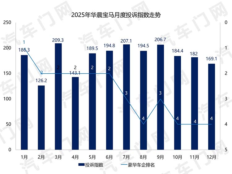 从月度投诉指数走势看,华晨宝马的单月投诉指数多在170-210之间,表现比较平稳,一直稳居传统豪华车企投诉榜前四位。