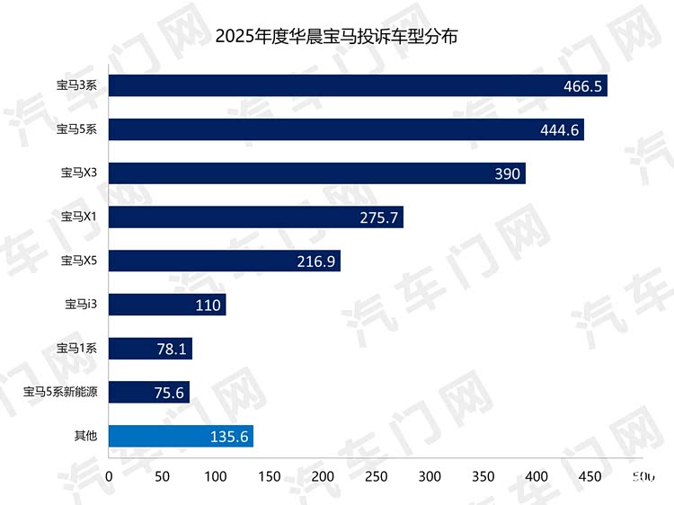 从涉诉车型分布来看,华晨宝马的主要投诉仍然集中于宝马3系、宝马5系、宝马X3和宝马X1等热销车型。几款车型的合计投诉指数占比超过了80%。这几款车也是各类传统豪华车投诉榜TOP10的“熟客”。