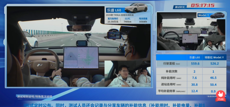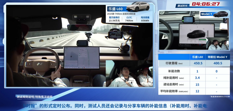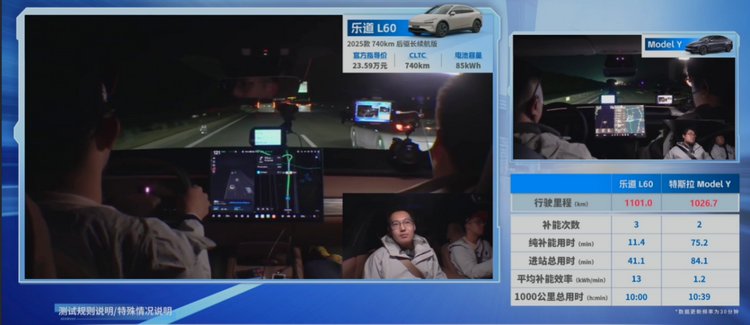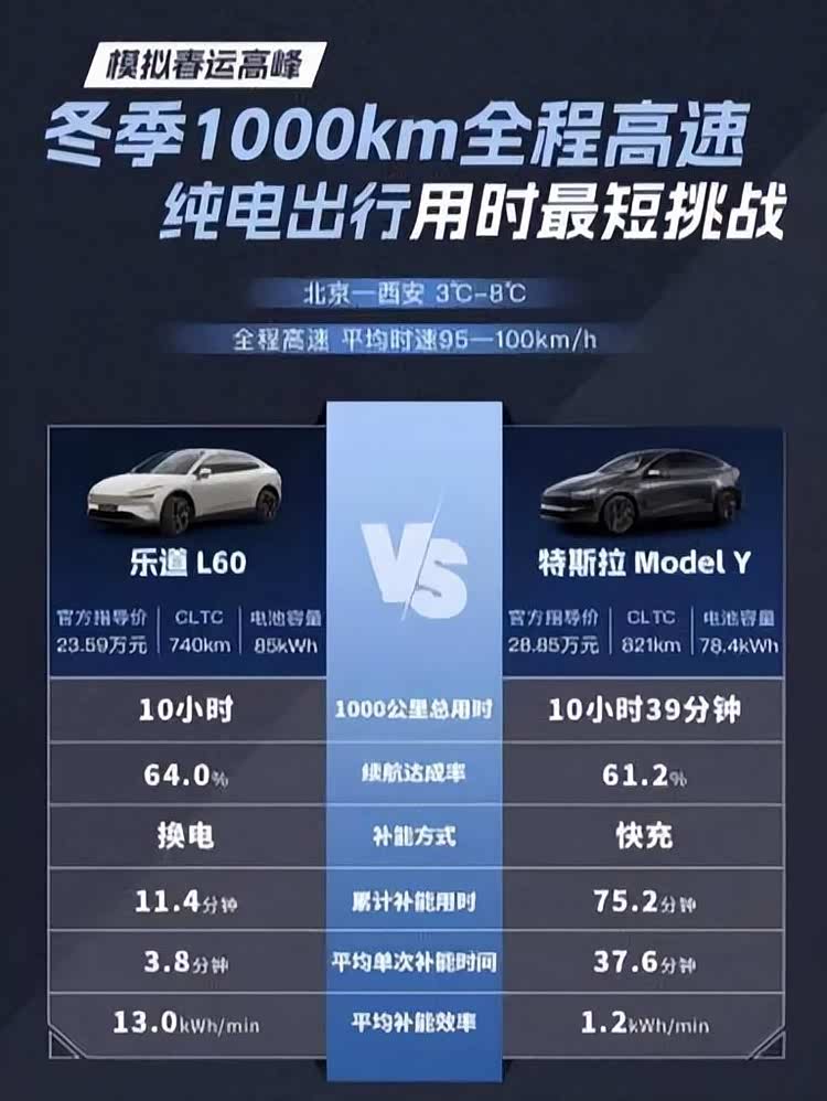 本次测试结果如下:乐道L60行驶1000公里用时10个小时,特斯拉Model Y用时10小时39分钟,乐道L60补能共计3次(换电),纯补能用时11分钟,特斯拉Model Y补能为2次,纯补能时间为75分钟,平均补能效率乐道L60为每分钟13kWh,特斯拉Model Y每分钟补能为1.2kWh,从结果来看,乐道L60虽然补能用时3次,但是时间只有11分钟,这个效率可以说就是在服务区休息一会上趟卫生间的时间,Model Y则需要1个多小时的补能时间,如果在节假日或春节出行的话,可能还需要更长的时间。