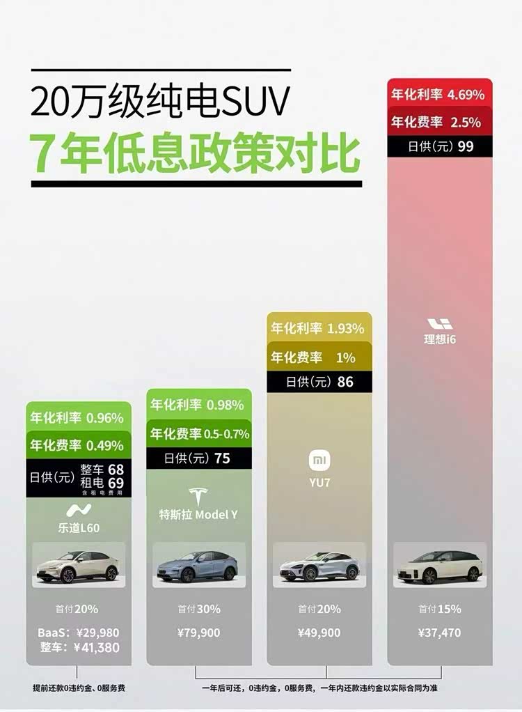 最近乐道L60 还有7年低利息政策,省钱才是真乐道,7年0.49%年化费率,首付20%起,日供低至69元,没有金融服务费,提前还款也没有违约金,BaaS租电方式购买只有14.99万起,相比竞争对手乐道L60的7年低息政策也有着一定的优势,购车方案也是更加丰富,让您购车没有任何顾虑,如果你对它感兴趣,可以去门店体验或咨询。