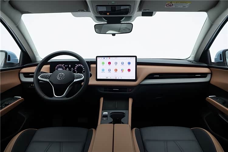 内饰这次是真跟上趟了。12.9英寸悬浮大屏+10.25英寸液晶仪表双屏联袂,AR实景导航直接投屏。最让我意外的是换上了怀挡设计——和ID系列同款,中控台一下子清爽了,无线充电、杯架布局合理多了。方向盘保留了实体按键,盲操比戳屏幕友好。30色氛围灯、前排座椅加热、后排出风口+充电口,该有的都有了。用料也是双色软包,质感比宝来强一档。