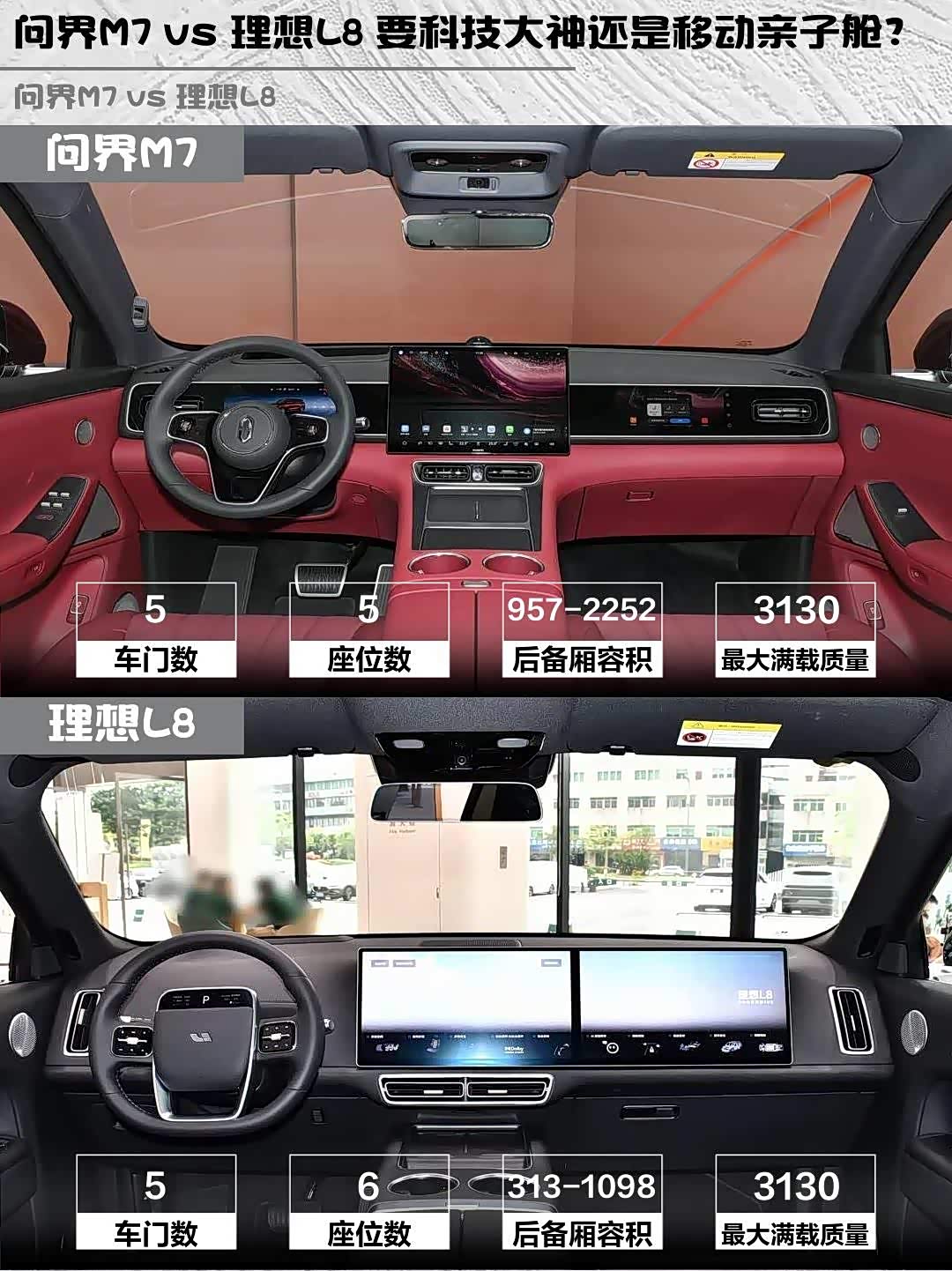 虽然都是5米级车身,但理想L8的6座布局更适合多孩家庭,二排独立座椅带腿托。问界M7五座版后排地台纯平,957L后备箱能装更多行李。要夸夸问界的零重力座椅,午休模式展开后堪比头等舱!