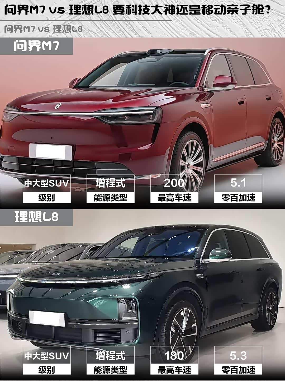 都是双电机四驱,问界M7 533马力+5.1秒破百比理想L8 449马力+5.3秒更猛。实际开起来问界的加速更跟脚,特别是运动模式下推背感强烈。不过理想L8的魔毯空悬过减速带更柔韧,问界则偏运动调校。