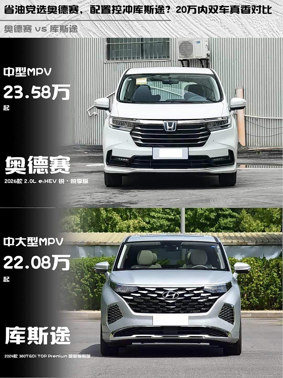 最近在选家用MPV的朋友看过来!今天深度对比两款热门车型—— 本田奥德赛(参数|询价)2026款2.0L e:HEV锐·悦享版和现代库斯途2024款380TGDi智爱旗舰版,实测干货分享给正在纠结的你~ 🚗💨