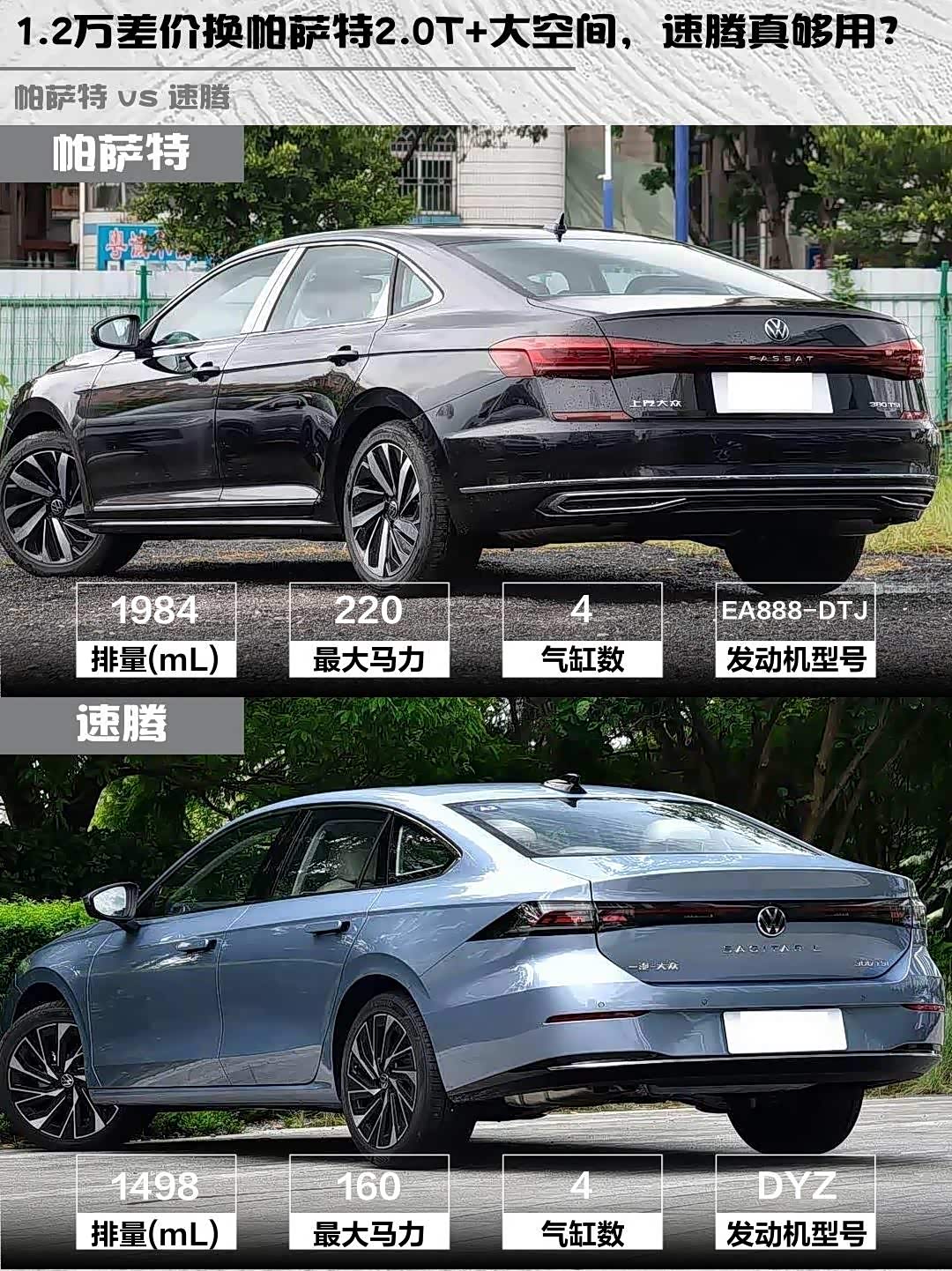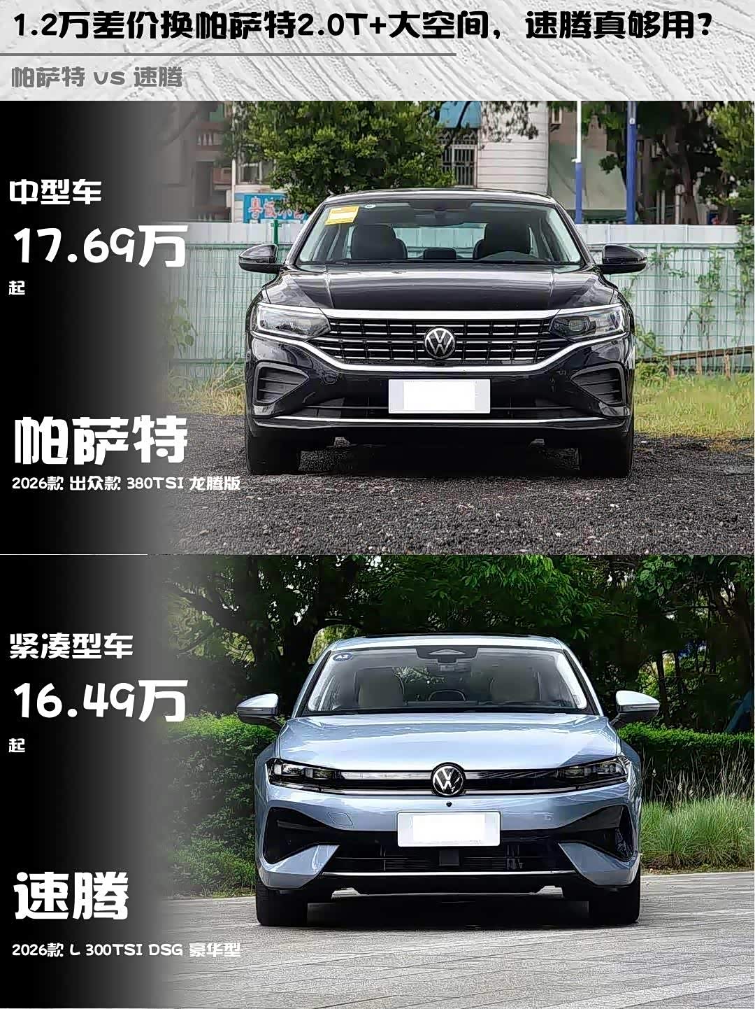 最近后台好多兄弟在问 帕萨特(参数|询价)2026款出众款380TSI龙腾版和速腾2026款L 300TSI DSG豪华型怎么选?作为开过两台车的过来人,今天从真实体验给你们盘一盘这对"大众双子星"的差异点!🔥