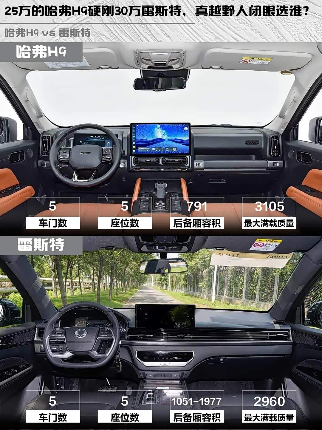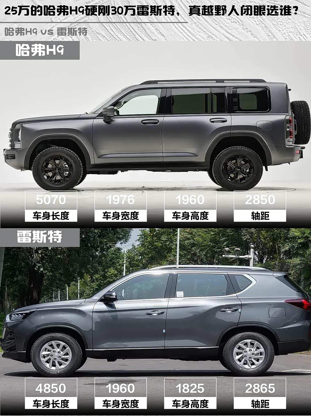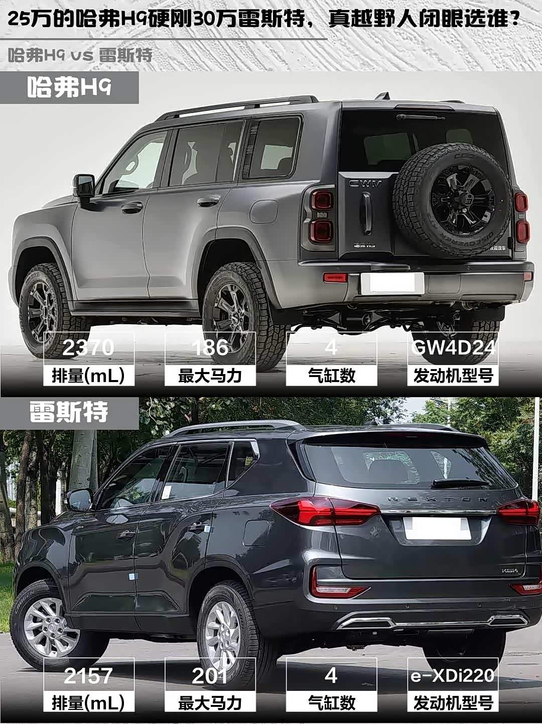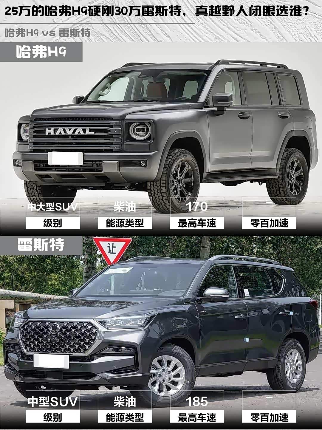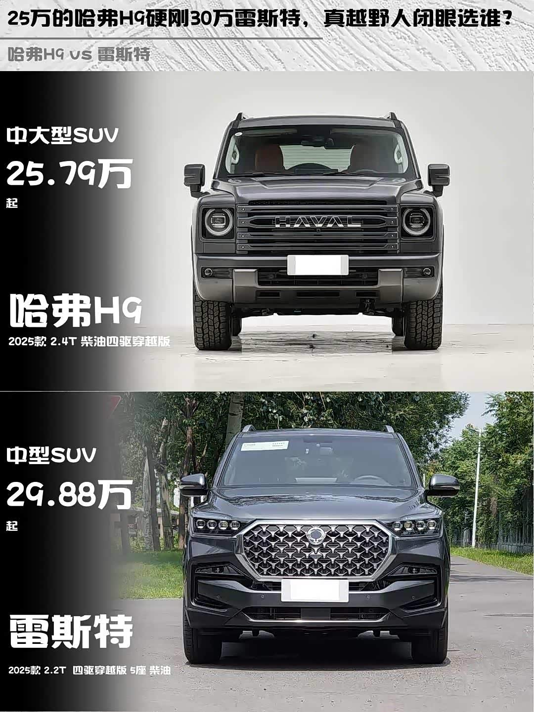 最近在选硬派越野车的小伙伴看过来!今天深度对比两款柴油四驱狠货—— 哈弗H9(参数|询价) 2025款 2.4T柴油四驱穿越版 vs 雷斯特2025款 2.2T四驱穿越版,实测干货直接上菜!🔥