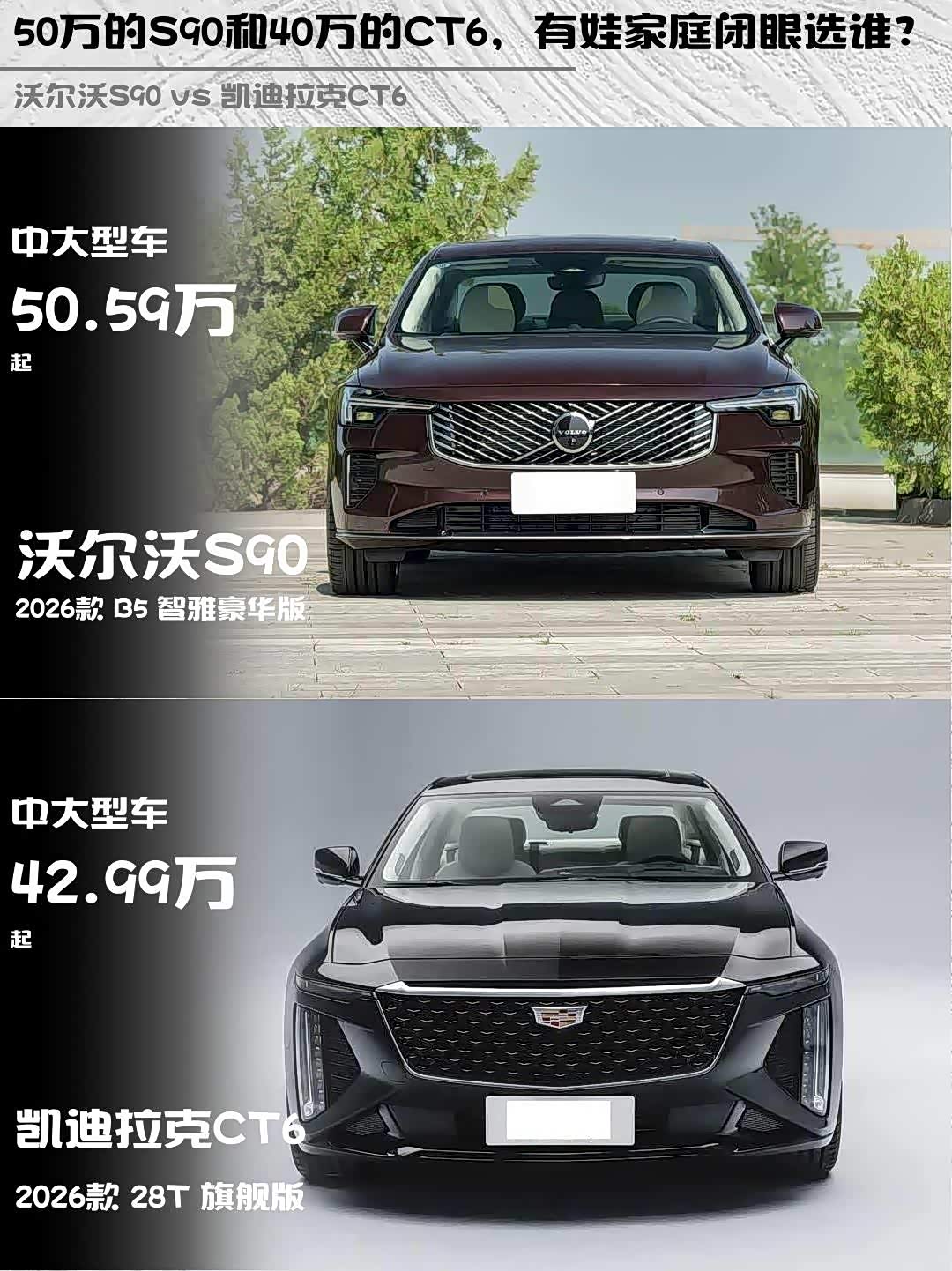 最近在选豪华中大型车,纠结沃尔沃S90 2026款 B5 智雅豪华版和 凯迪拉克CT6(参数|询价) 2026款 28T 旗舰版,深度对比后分享干货!两款车风格差异明显,看完你就知道哪款更适合自己了👏