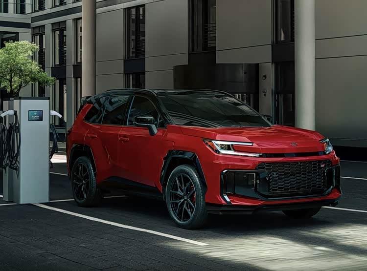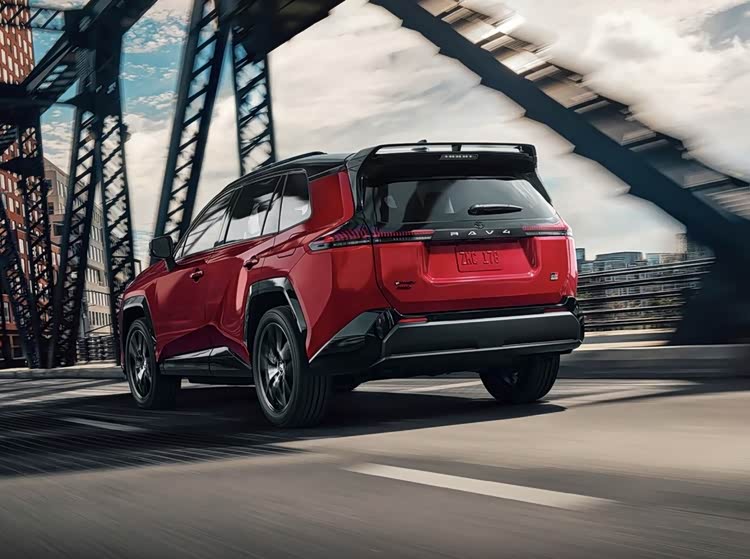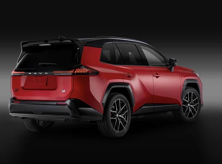 车身侧面线条硬朗流畅,配备多辐式轮毂,GR SPORT版还搭载235/50 R20黑色铝合金轮圈与红色刹车卡钳,轮眉、后视镜外壳均做黑化处理,进一步强化运动属性。车尾设计简洁大气,竖条幅光源尾灯由黑色饰板贯通,中央保留丰田与RAV4标识,兼顾辨识度与高级感,隐藏式排气布局契合新能源车型的简约调性,下方保险杠配备银色护板,与车头前唇形成呼应,整体造型在运动与家用之间实现完美平衡。