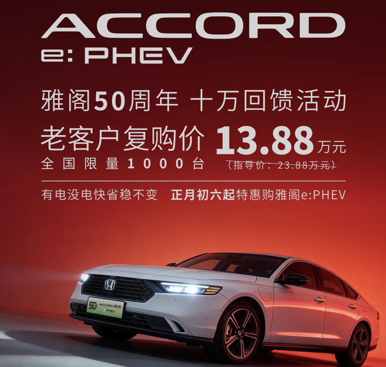 2月22日,广汽本田在其官方渠道发布了一项信息。为纪念雅阁车型问世50周年,该品牌推出了一项针对老客户的特别措施。符合条件的原有车主再次选购雅阁e:PHEV这一插电混动版本,可以以一个特定的价格完成购买。这个价格设定在13.88万元,而该举措提供的名额为1000个。根据公开信息,雅阁e:PHEV车型此前的市场指导价格为23.88万元。