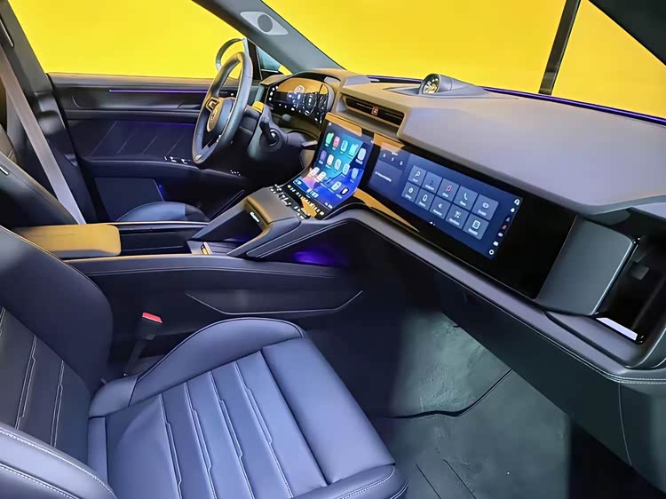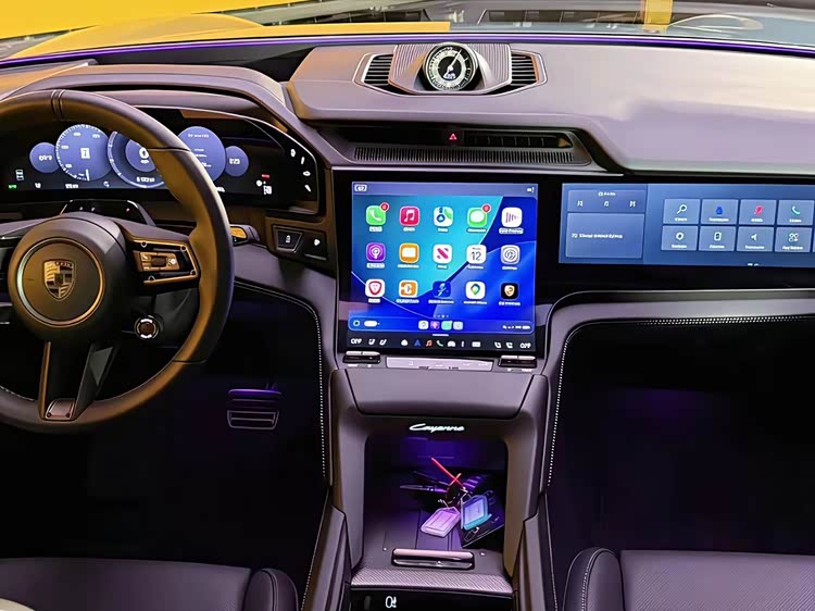 内饰方面,纯电卡宴的内饰采用全新的数字化座舱设计,由四块屏幕组成,包括14.25英寸OLED全液晶仪表盘、12.25英寸可弯折中控触摸屏、可选装的14.9英寸副驾娱乐屏,以及用于空调控制的触摸面板。此外,还可选装87英寸的增强现实抬头显示系统。