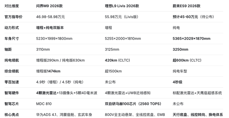 2026年的50万级全尺寸SUV市场,问界M9、理想L9、蔚来ES9用三种截然不同的路径,诠释了“国产旗舰”的多种可能。