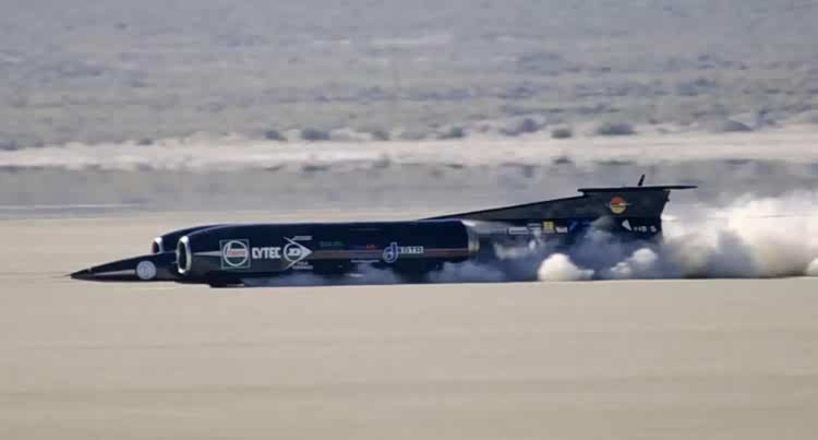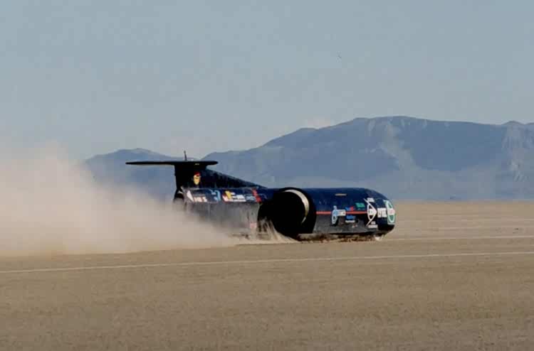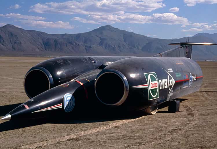显然轮胎驱动的车辆无法破音速,60年代,有人提出一个激进的想法:如果车轮不再负责驱动车辆,只负责让车辆留在地面上,速度是否还能继续提升?这个想法很快变成现实,喷气发动机和火箭发动机被引入。推力不再通过传动系统传递,而是直接作用于车体,车辆变成了一枚贴着地面飞行的飞行器,车轮的任务变成了导向和刹车。