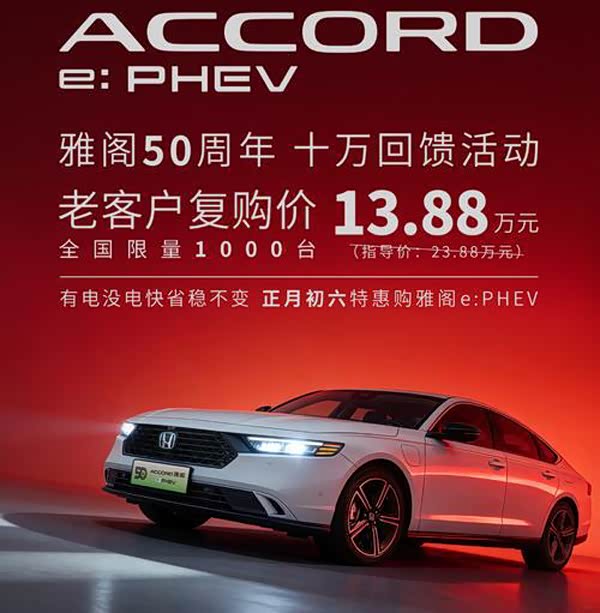 《车矩阵》车市导购:2026春节假期尚未结束,车市终归还处于平静之中,厂家大多还未复产。2月22日,广汽本田却用一个新春的政策给这平静的车市带来了波澜,为庆祝雅阁50周年,广汽本田宣布针对老客户复购指导价为23.88万元的雅阁e:PHEV车型,仅需13.88万元,限量仅1000台。