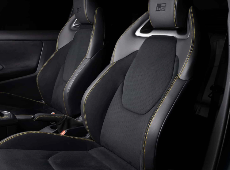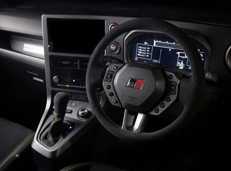 进入车内,丰田GR Yaris Morizo RR也更加极致,采用了Alcantara面料铺陈,还加入了黑色碳纤维装饰面板,配备了赛车化的方向盘,采用了翻毛皮材质包裹,直径较普通版更小,提供更佳的手感和操控精确度。方向盘内部集成了多个类似F1赛车的控制旋钮,布局逻辑与方程式赛车相似,使驾驶者能在双手不离开方向盘的情况下调整车辆参数。该车前排配备了桶装赛车座椅,头枕还带有“GR”浮雕,采用了麂皮绒和织物材质的交替混搭,提供了更好的包裹性和支撑性,还加入了四点式安全带,一切以驾驶功能为核心。