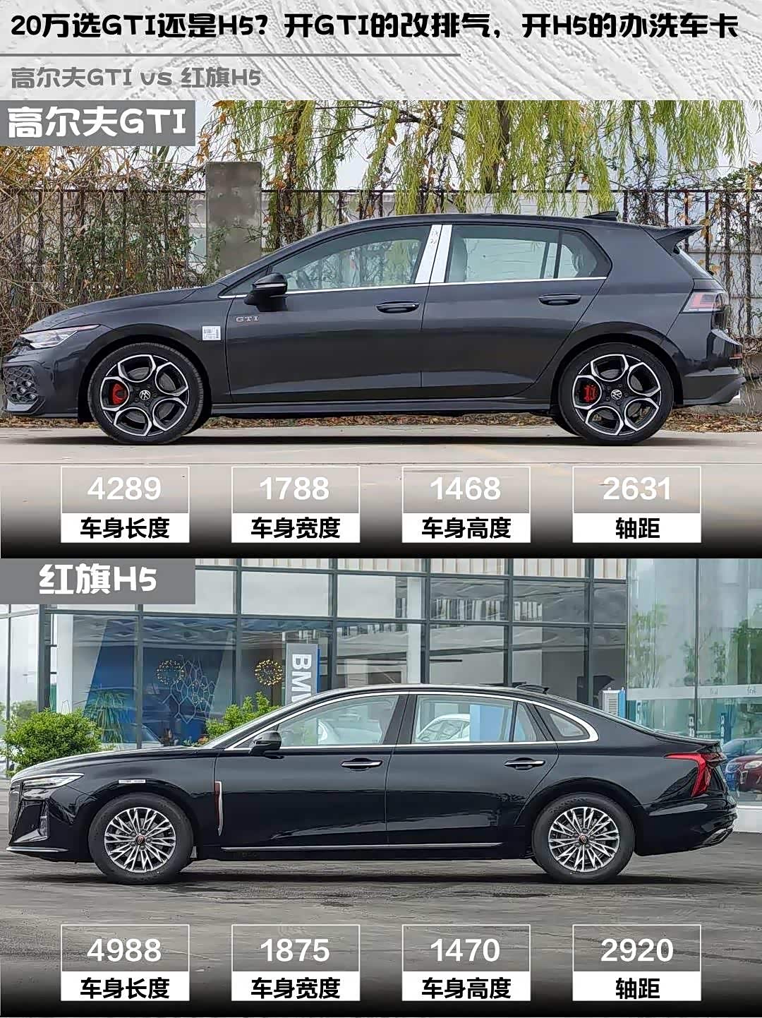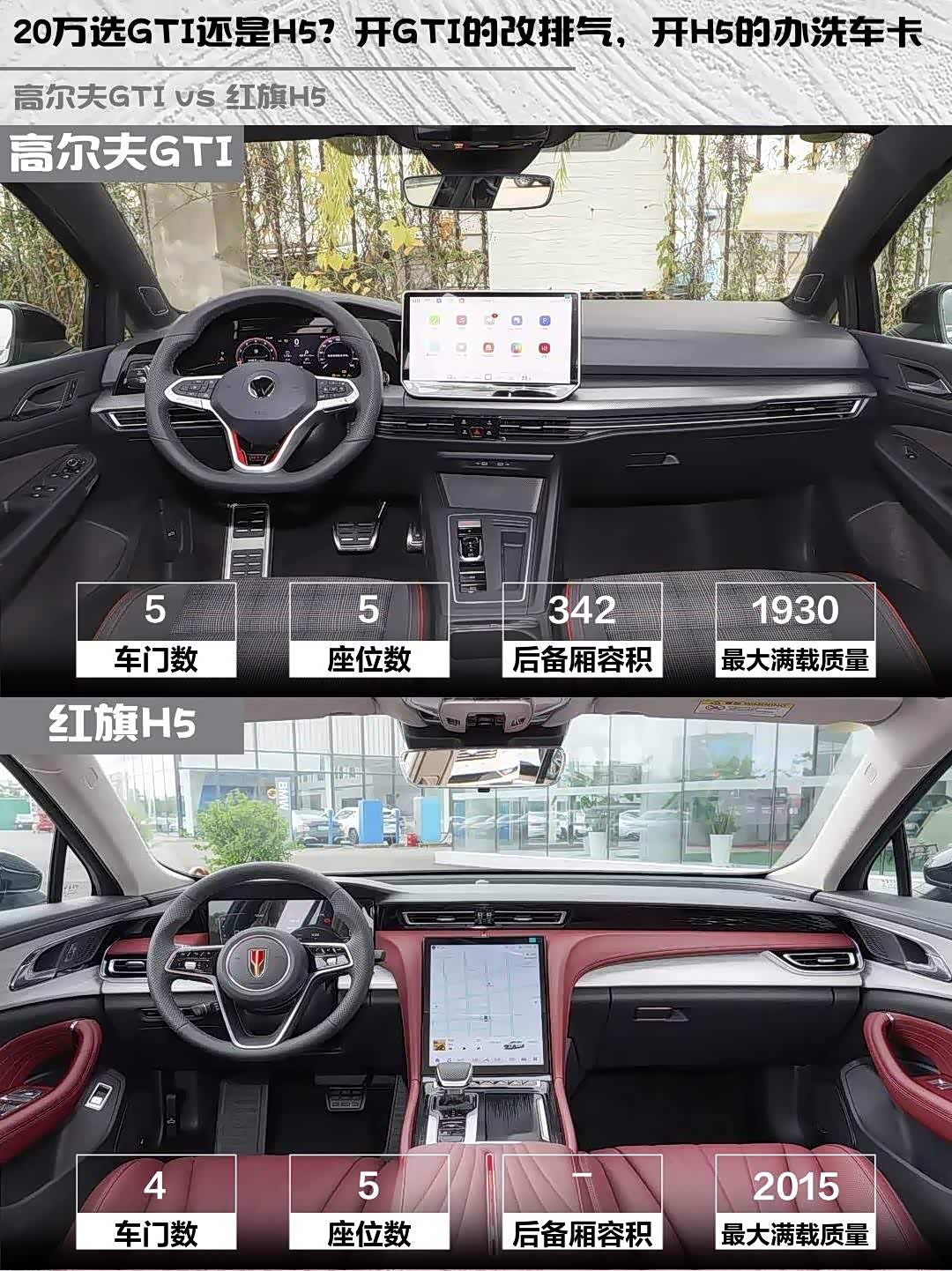 要驾驶乐趣选GTI:电子挡把换挡手感绝了,改装潜力大,适合周末跑山的热血青年。要面子+实用选红旗H5:气场不输56E,带爸妈出行不会被吐槽空间小。偷偷说,GTI车主大概率会改排气,而红旗车主...大概率会在洗车店办卡(黑色车漆太显脏了!)