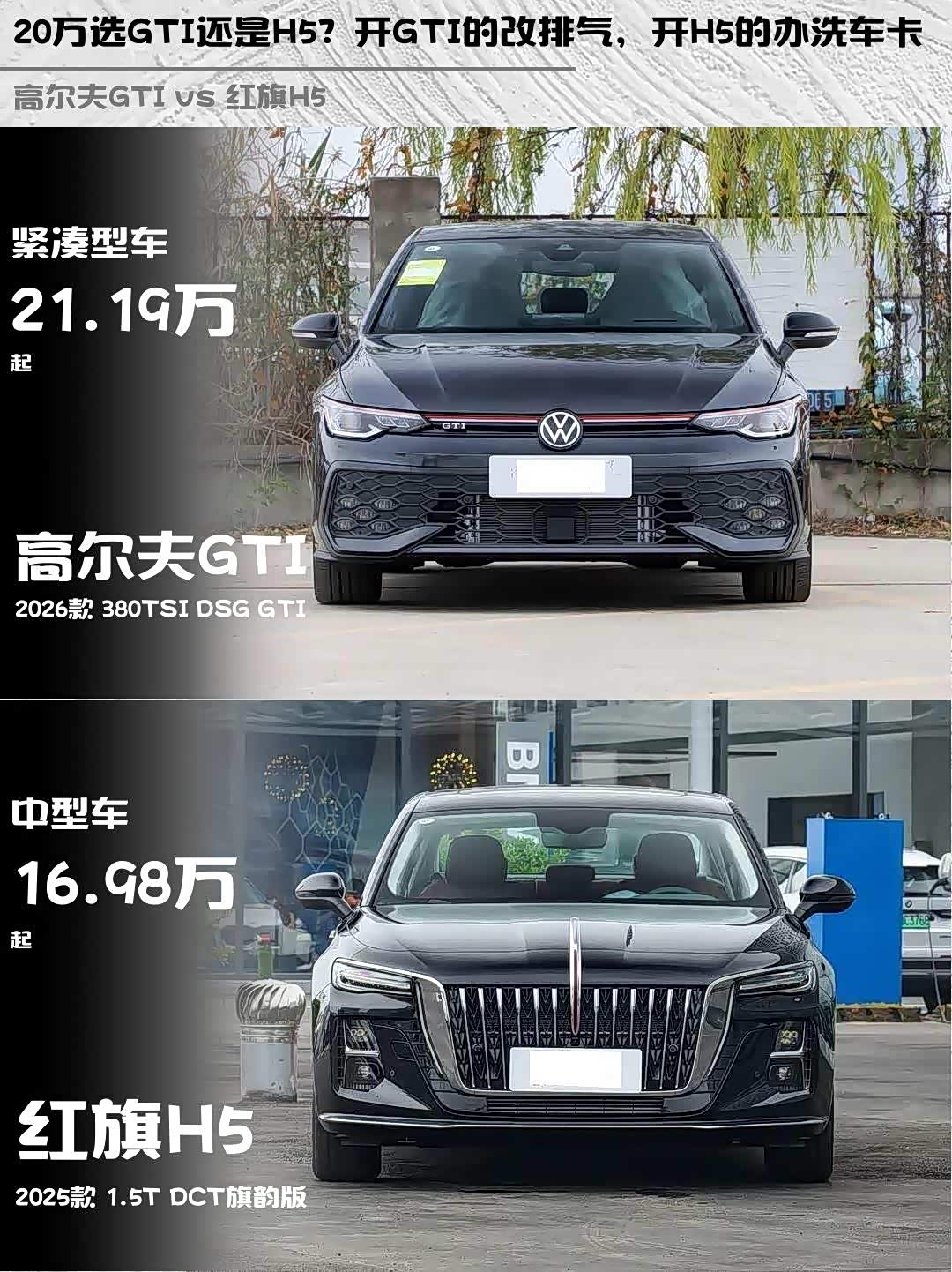 最近后台好多人在问:20万预算,想买台有性格的车, 高尔夫GTI(参数|询价) 2026款 380TSI DSG GTI和红旗H5 2025款 1.5T DCT旗韵版怎么选?🤔 作为开过两台车的"老司机",今天掏心窝子聊聊这对"德系小钢炮vs国产行政咖"的差异!