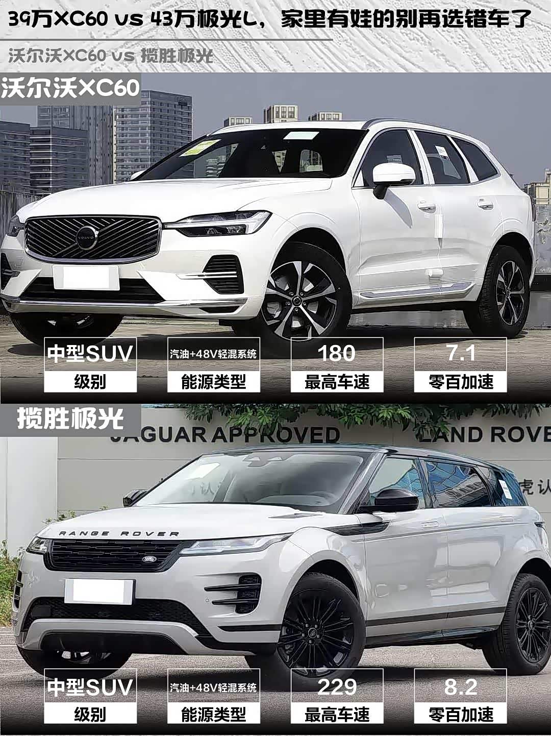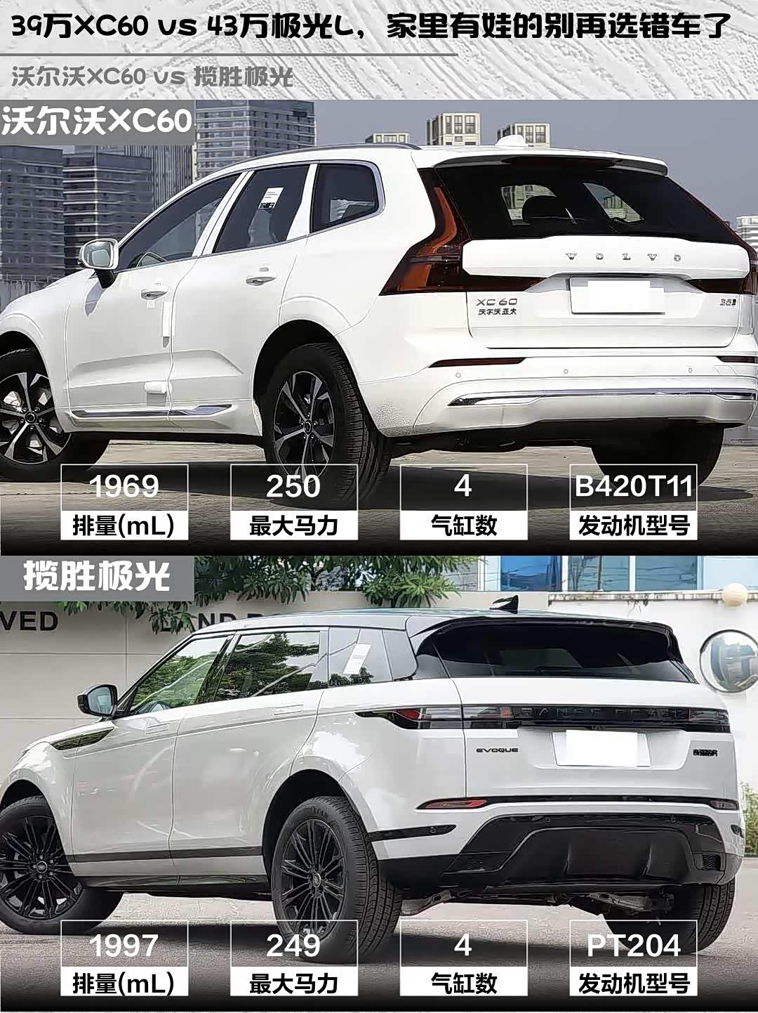 🌟【安全与健康】沃尔沃XC60绝对是王者!标配City Safety城市安全系统,主动刹车、车道偏离预警全都有,还有环保座舱,暴晒都没异味,家里有宝宝的首选!👶 揽胜极光虽然也有L2辅助驾驶,但新车异味问题被吐槽较多,环保属性稍逊一筹。