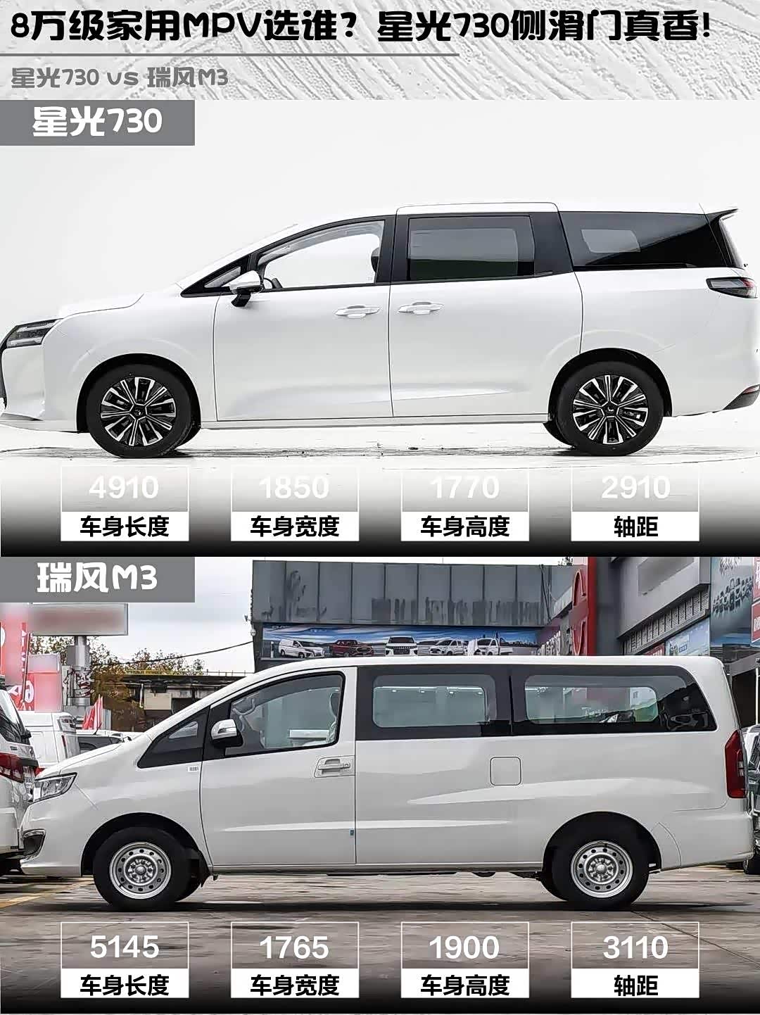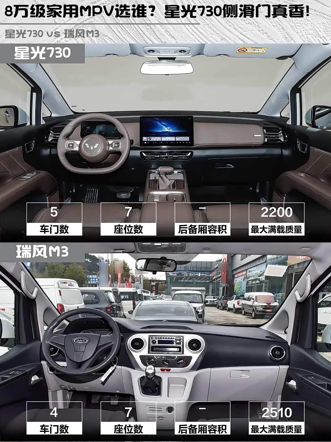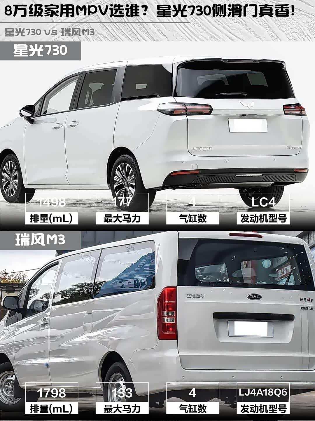 车家号·0浏览·2026-02-23 08:46 · 北京最近在选家用MPV的朋友看过来!今天给大家深度对比两款8万级热门车型—— 星光730(参数|询价) 2025款 1.5T CVT精英型和瑞风M3 2025款 PLUS 1.8L手动经典版7座,实测干货分享来啦!🚗💨