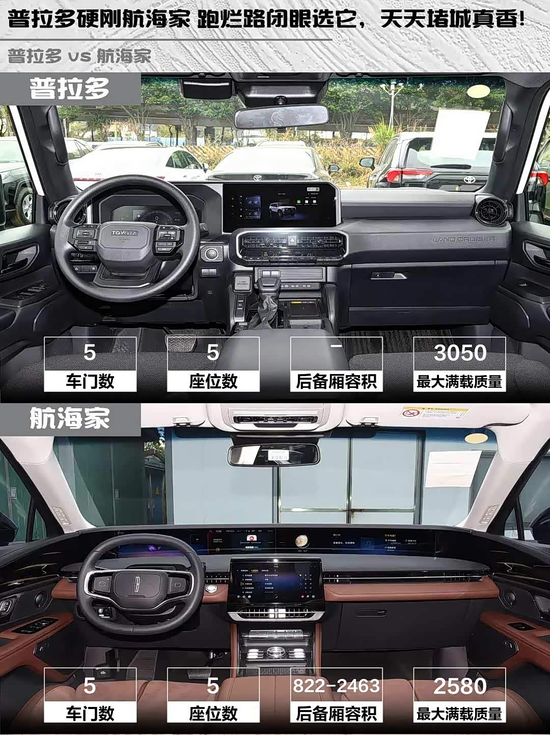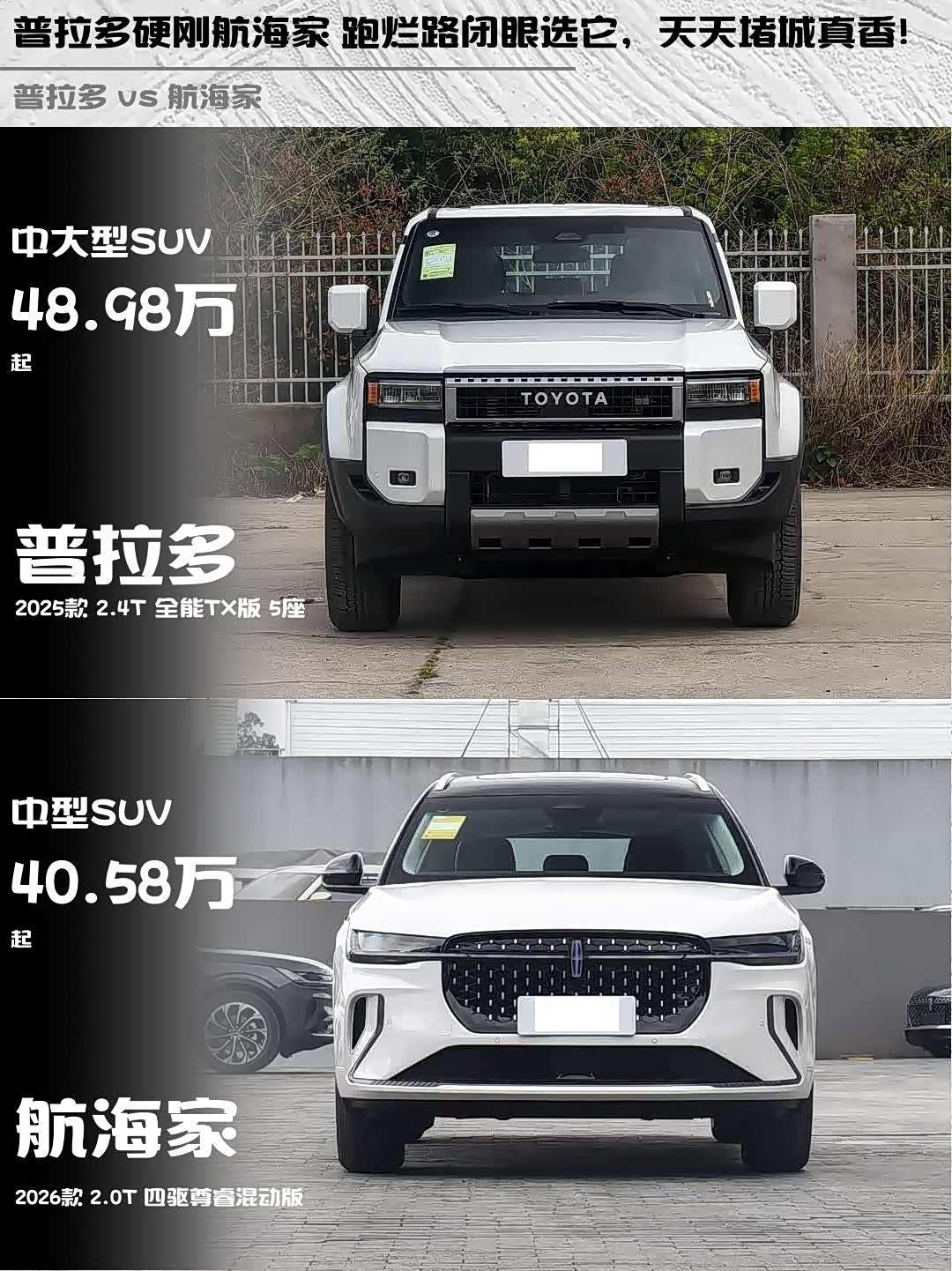 最近后台好多兄弟在问: 普拉多(参数|询价) 2025款 2.4T 全能TX版 5座和航海家 2026款 2.0T 四驱尊睿混动版到底怎么选?作为深度体验过两台车的老司机,今天直接上干货对比!🔥
