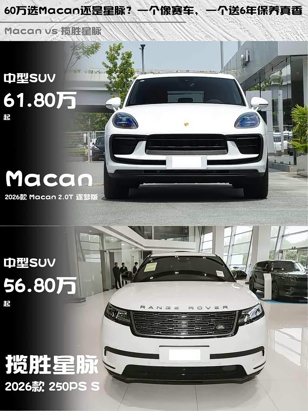 车家号·0浏览·2026-02-23 08:57 · 北京最近在纠结2026款 Macan 2.0T 逐梦版和2026款 揽胜星脉(参数|询价) 250PS S的朋友看过来!这两台60万级豪华SUV到底怎么选?实测对比干货奉上👇