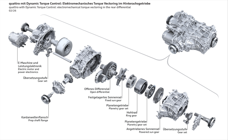 而最亮眼的,当属其搭载的quattro动态扭矩控制系统——全球首发的机电式扭矩矢量分配技术,核心是一台8千瓦、40牛·米的永磁水冷电机作为高压执行器,搭配超速档齿轮和低锁止率传统差速器,每5毫秒(频率200赫兹)就会重新计算一次后轮最佳扭矩分配,15毫秒内即可完成调整。入弯时,它能稳定车身、减少转向不足;出弯时,可将扭矩精准输送至外侧车轮,拉满抓地力。