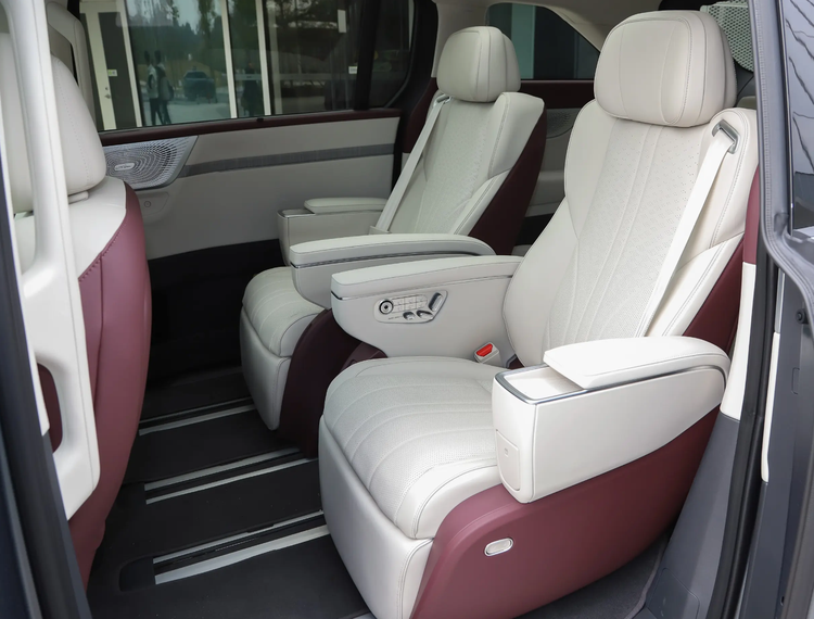 小鹏X9最让我满意的设计是座椅,除了是航空布局,零重力之外,双色搭配的皮革显得高端高级许多,更符合商务的属性。然后座椅内部海绵也带有记忆慢回弹属性,就坐上去的感觉特别有回弹性很柔软舒服。舒适功能更加全面,腿托也很厚实,也支持纯平放倒,双扶手很宽大,包括整个包裹性堪比按摩座椅,第二排也是支持前后移动,中间通道也很宽敞,给我感觉更像是移动的高铁,然后很多功能也可以语音开启,像滑动车载冰箱、车顶娱乐屏、前排小桌板等核心功能配件都有,因为第二排可以灵活移动,因此也保住了第三排的空间,可以说第三排空间依旧很宽敞,像这样的商务MPV不必担心空间不足,甚至第三排座椅还支持调节,也能获得一个较为不错的坐姿,虽然与第二排坐姿和舒适度有点落差,但我个人还是能接受的,至少保证舒适度。