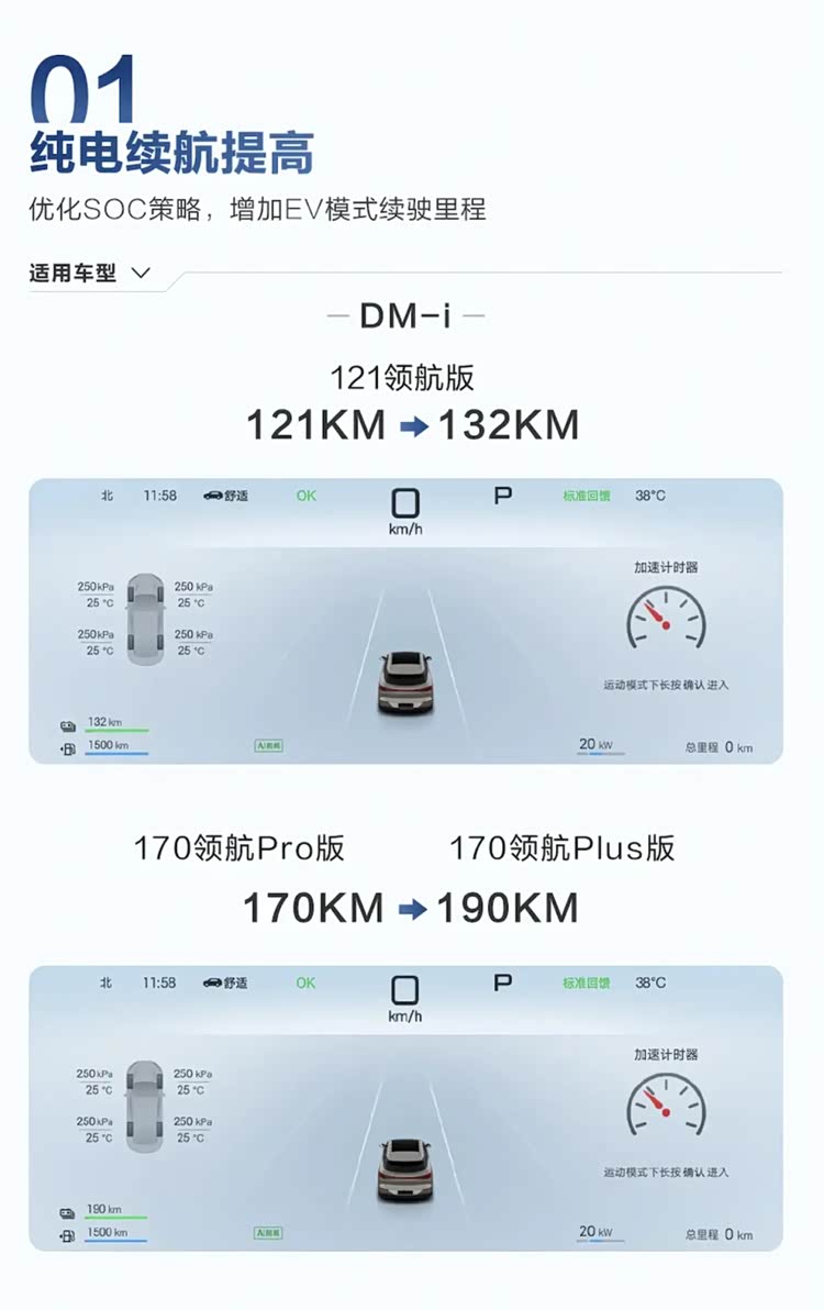 这还没完,前不久海狮06刚做过一轮OTA升级,部分车型续航已经提升:121领航版从121km增至132km,170领航Pro版和Plus版从170km提到190km,开启长续航功能后还能进一步扩展到205km。比亚迪这波操作,确实是“听劝”的厂家。