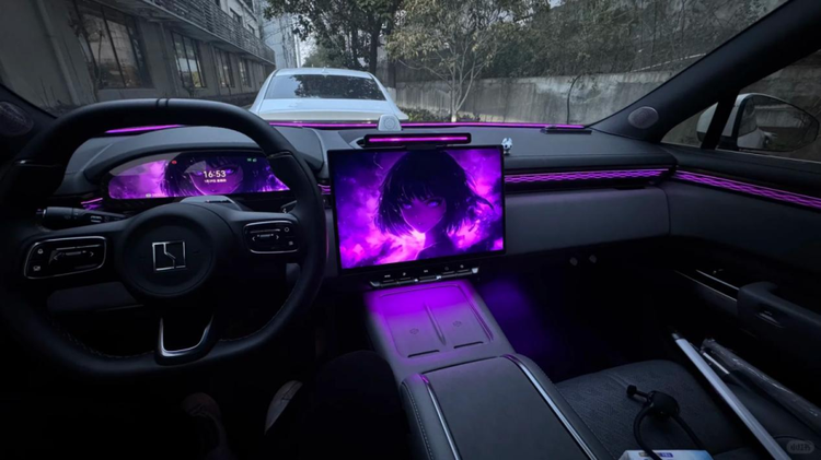 拉开车门,紫色氛围灯还亮着昨晚调的渐变色。