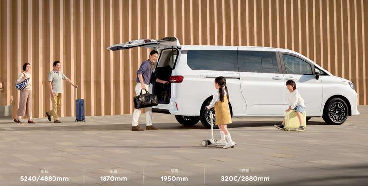 从定位来看,锐胜王牌 M7 属于中大型 MPV,长轴版车身尺寸达到 5240×1870×1950mm,轴距长达 3200mm,更长的轴距意味着更充裕的纵向空间。车身结构采用承载式设计,搭配平开门 + 右侧手动侧滑门,上下车便捷,兼顾家用舒适性与商用实用性。整车提供破晓白、星夜黑、凯旋金三种外观颜色。