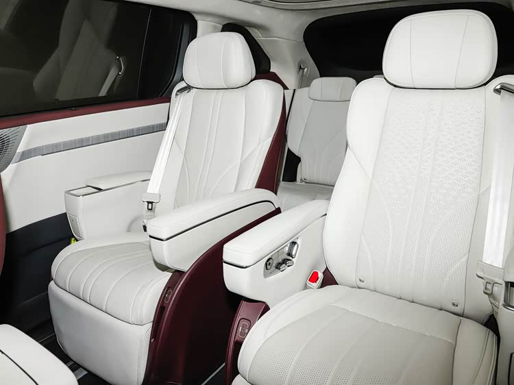 第二排依旧是豪华重点。航空座椅、零重力设计、双色皮革,视觉和触感都偏商务风。座椅带记忆慢回弹属性,腿托厚实,支持纯平放倒和前后移动,中间通道宽敞。滑动车载冰箱、车顶娱乐屏、小桌板这些配置都给到,第三排也保留充足空间并支持调节,满足多口之家出行。