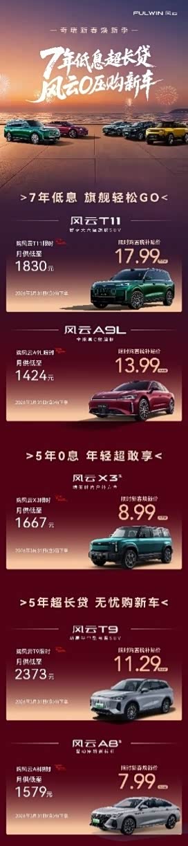 新年伊始,风云品牌将以更完善的产品矩阵、扎实的市场口碑和真金白银的政策礼遇,为用户开启通往绿色智能出行的坦途。无论是追求旗舰享受的风云A9L,还是向往豪华体验的风云T11,总有一款能承载用户对新年的期待。即日起,欢迎莅临全国奇瑞风云销售经销店,亲身体验轻松购车之旅,让风云伴你策马扬鞭,驶向更美好的未来。