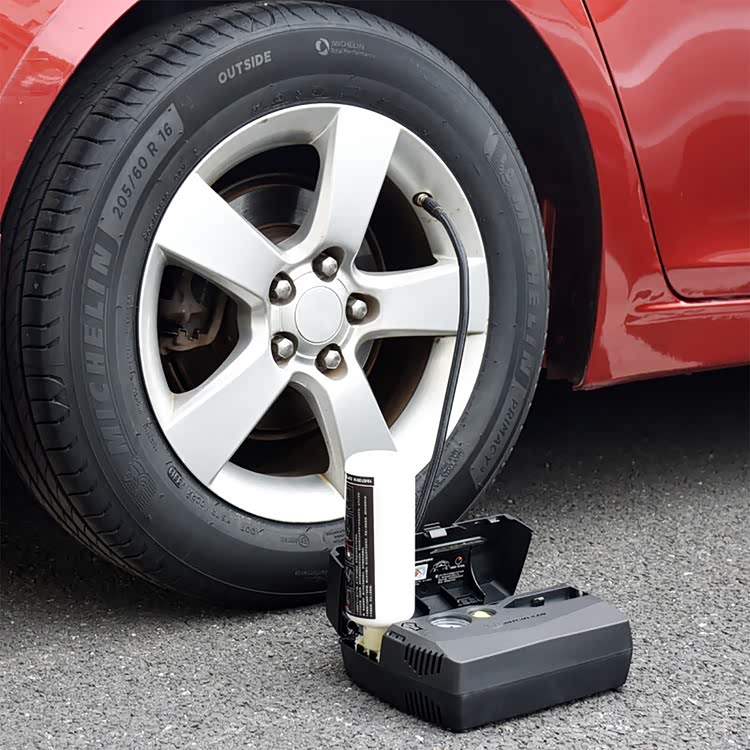 使用时按要求把补胎液拧在充气泵对应接口上,然后连接电源和气嘴,打开开关就可以了。气泵在充气的时候会把补胎液也注入轮胎内,只要不是轮胎有大缺口,都可以止漏。不过充气的时候记得打着车,以免电瓶过放电。