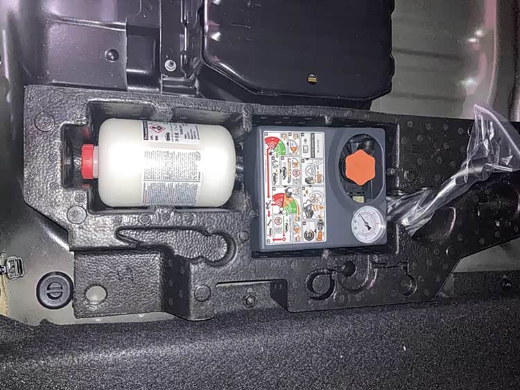 虽然有些车没备胎,但厂家肯定会配备一个打气泵以及一瓶补胎液以备不时之需,一般都会放在后备箱备胎槽里,这是法规强制要求的。