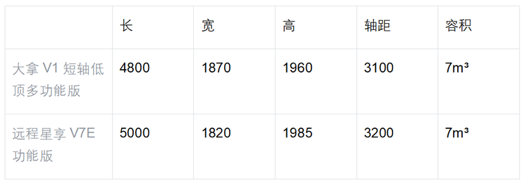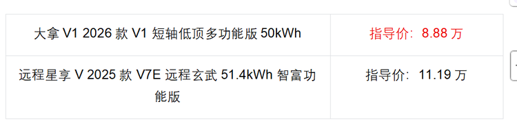 本次对比车型为:大拿 V1 2026 款短轴低顶多功能版 50kWh(指导价 8.88 万)、远程星享 V 2025 款 V7E 玄武 51.4kWh 智富功能版(指导价 11.19 万)。