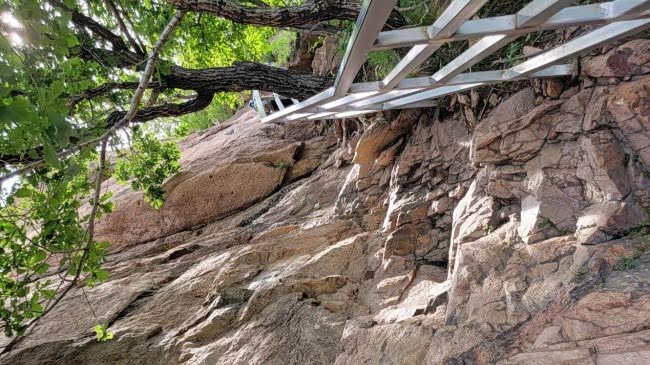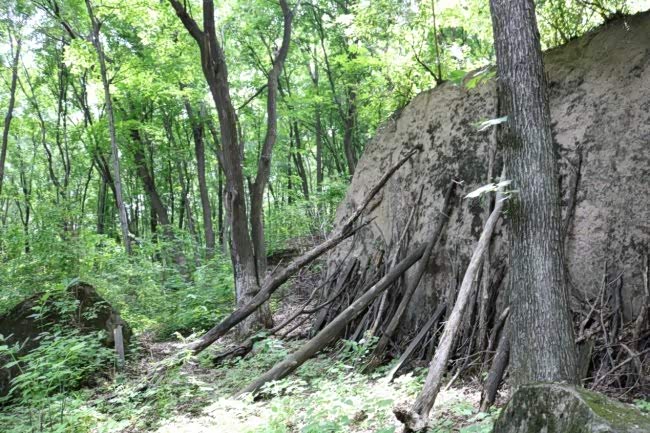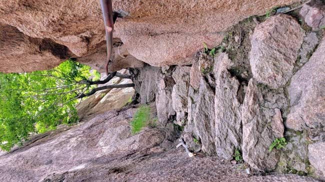 为了登顶,我们还爬了一段山路,开车确实上不去了,还看到了这个树枝支的大石头,这就叫作靠山,给自己找靠山呢