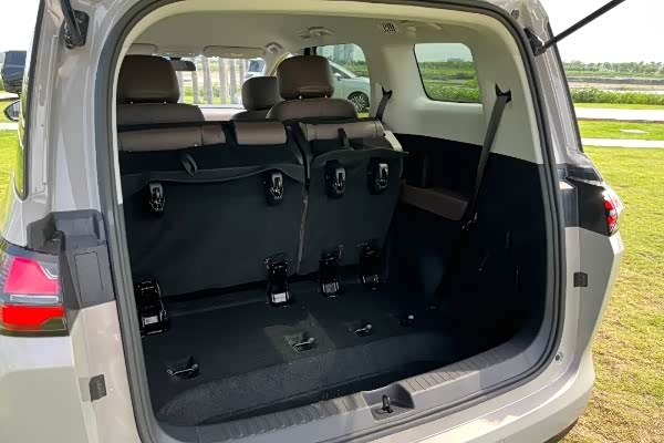 空间是七座车的灵魂,星光730插混版4910mm车长、2910mm轴距是账面数据,实际体验是:第三排坐两名一米七五的成年人,膝盖不顶前座、头顶不扫棚顶,靠背还能往后仰到127度。往返四小时的短途出游,第三排家人不用中途换姿势。二排过道宽230mm,进出第三排不用侧身收腹,老人孩子都能从容通过。后备厢是另一个惊喜点——满员状态下能竖着塞进三个24寸登机箱加若干软包;三排座椅翻折后,进深拓展到1202L,过年拉年货、搬家运家电、周末拉孩子的平衡车,基本不需要纠结“坐人还是装货”。车内25处储物格不是摆设,副驾手套箱能分类放证件和保单,二排门板槽刚好卡住孩子的吸管杯,三排杯架甚至考虑了奶瓶的高度。