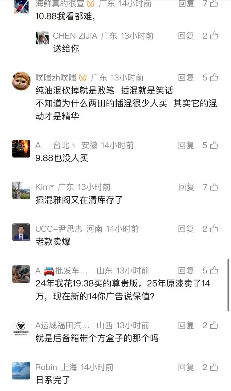 同时,大幅降价也彻底击碎了日系车的保值神话。有车主表示:“24年花19.38买的尊贵版。25年原板原漆卖了14万,现在新车卖14万,你告诉我说保值?”老车主资产大幅缩水,也让潜在消费者顾虑重重,形成“越降价越不敢买”的循环,也难怪有网友对比直言“老款卖爆”。