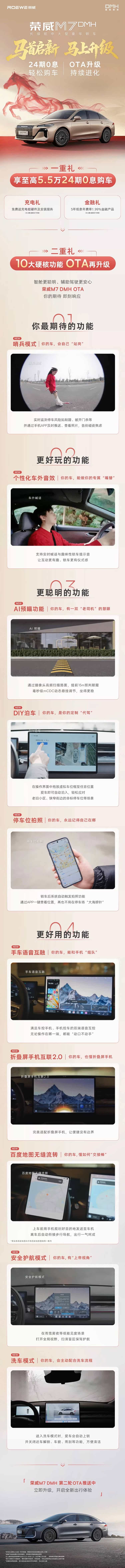 车家号·0浏览·2026-02-23 23:44 · 广东目前,根据官方获悉,荣威 M7 DMH 推送新一轮 OTA 升级。据了解,此次 OTA 主要聚焦用户体验,带来哨兵模式、趣味性车外音效、AI 预瞄、DIY 泊车、停车位拍照等十项功能更新。