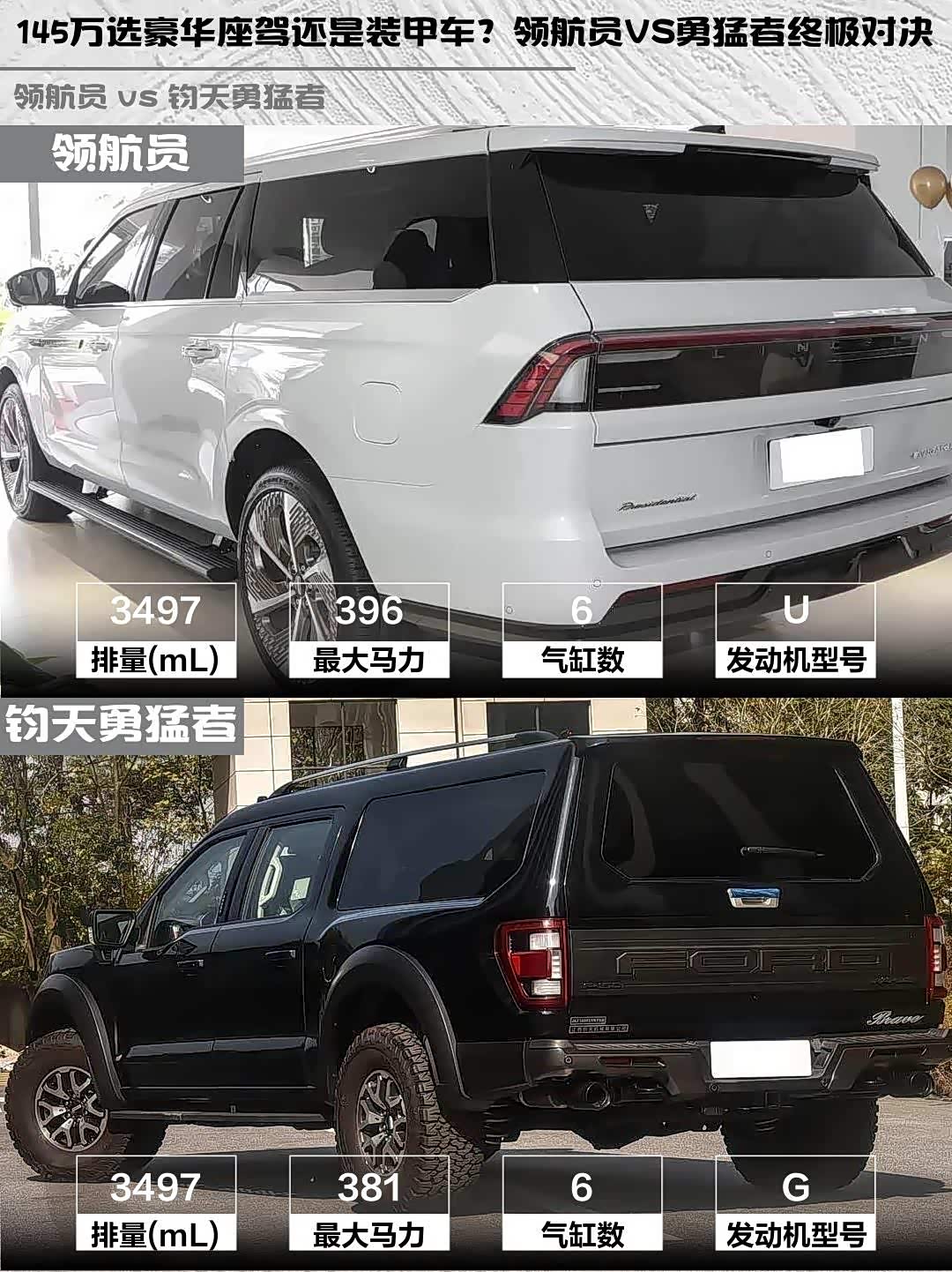 两台都是3.5T V6双涡轮,领航员396马力+10AT变速箱,零百加速6秒的陆地游艇不是吹的;勇猛者381马力但扭矩更大(672N·m),更适合越野脱困。油耗方面领航员WLTC 11.88L/100km,勇猛者NEDC 11.7L,但实际开起来领航员城市15-18L更吃油,勇猛者高速居然能跑到11L!