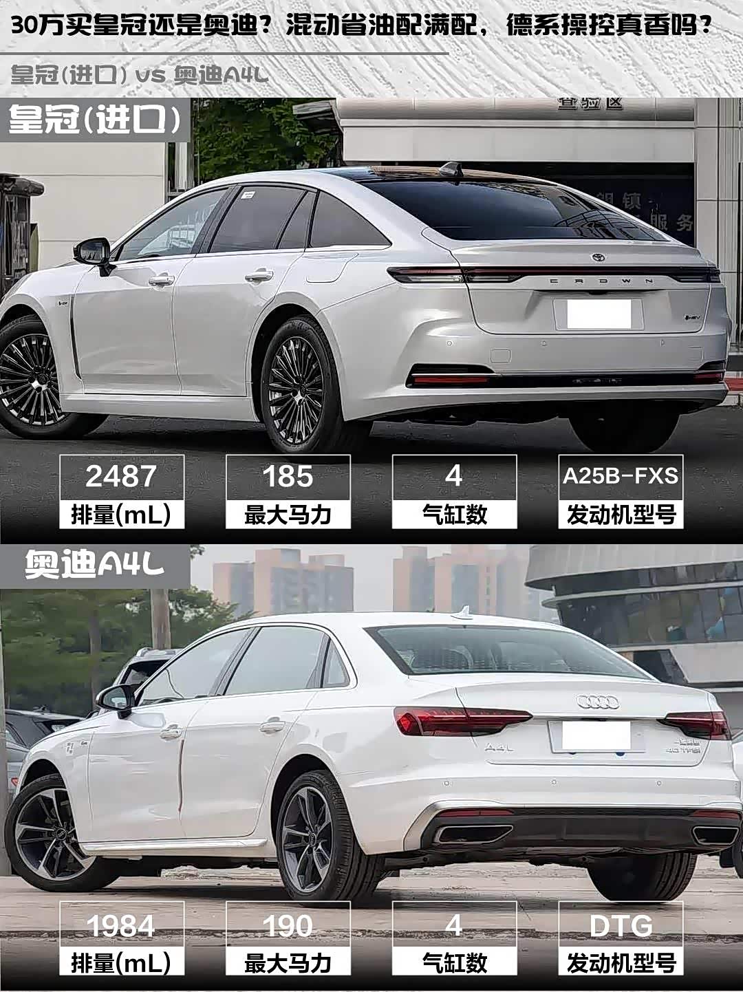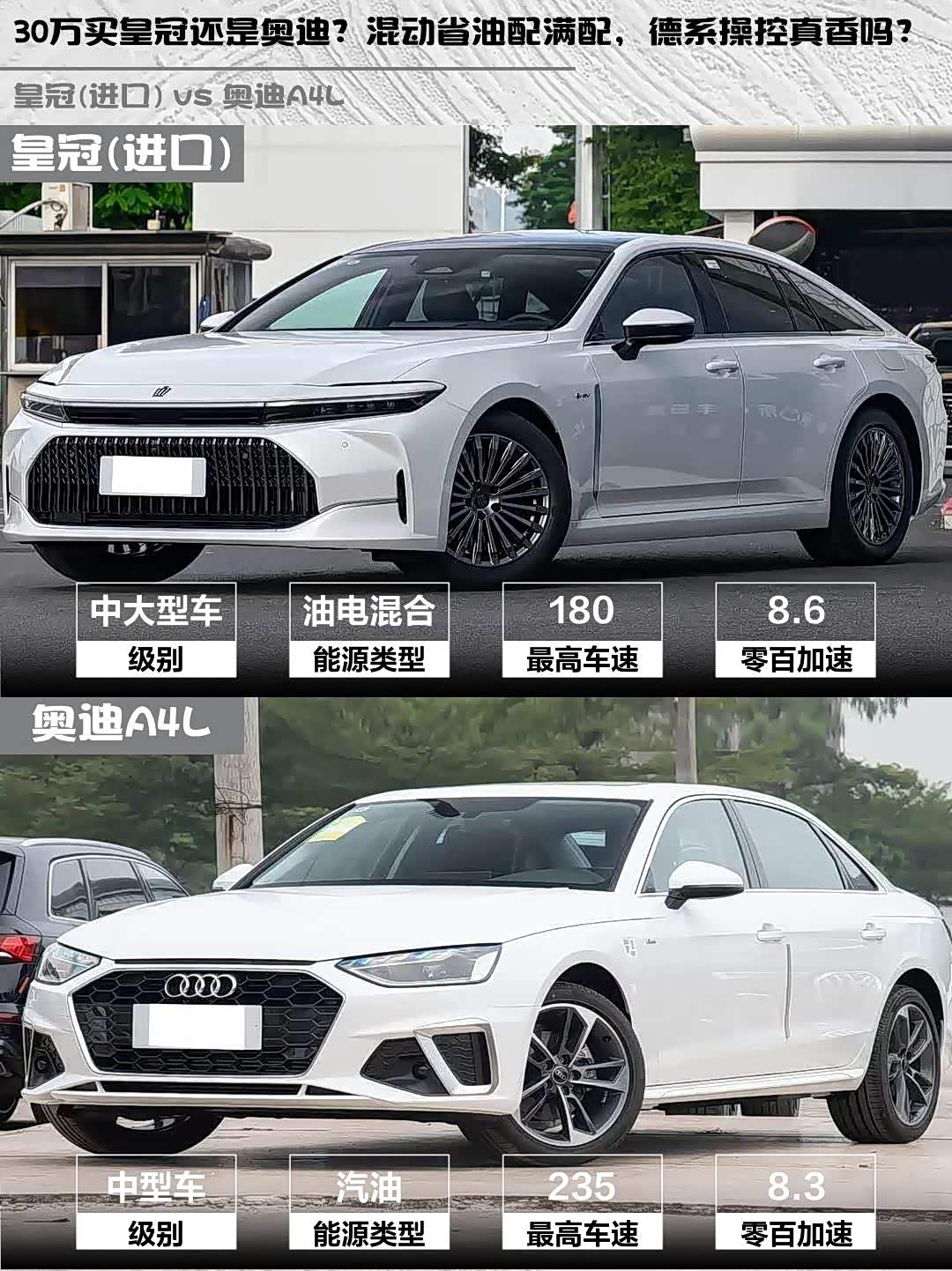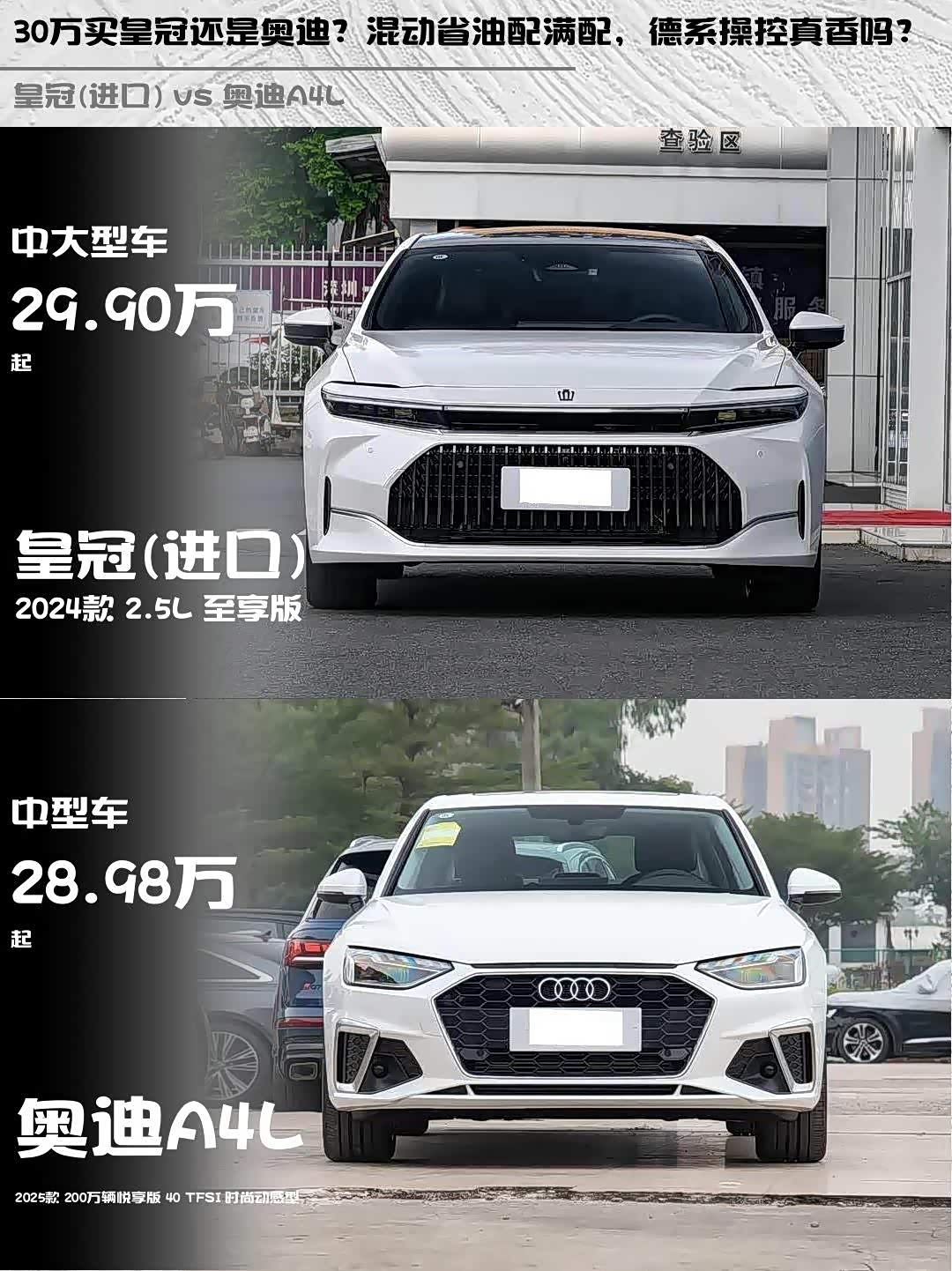 皇冠(进口)(参数|询价) 2024款 2.5L 至享版 vs 奥迪A4L 2025款 200万辆悦享版 40 TFSI 时尚动感型,30万级豪华车怎么选?🤔