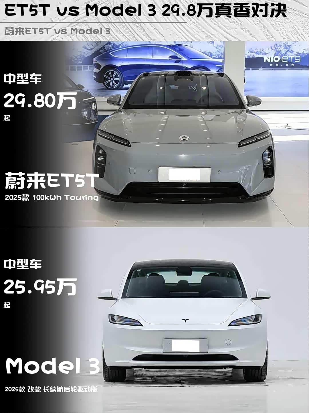 最近在纠结 蔚来ET5T(参数|询价) 2025款 100kWh Touring和Model 3 2025款 改款 长续航后轮驱动版的朋友看过来!作为深度体验过两台车的车主,掏心窝子分享真实对比感受👇