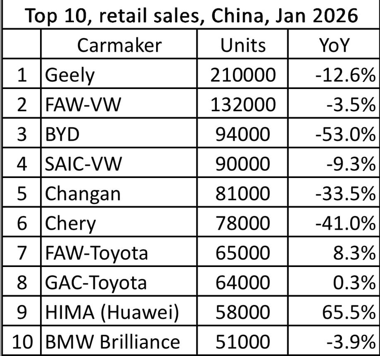 相对而言,增长最为迅猛的是鸿蒙智行联盟(Harmony Intelligent Mobility Alliance,简称HIMA),这是由华为主导的合作体系,成员包括问界(Aito)、智界(Luxeed)、北汽集团(BAIC)及享界(Maextro)等品牌。HIMA同比暴涨65.5%,并首次跻身前十,显示科技生态与汽车深度整合的模式正在快速释放市场影响力。