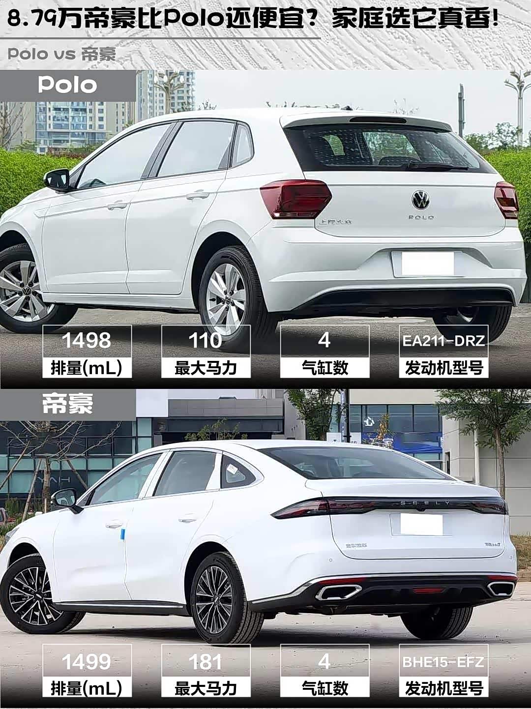 最近在选车的小伙伴看过来!今天给大家深度对比两款热门车型:Polo 2023款 改款 Plus 1.5L 手动纵情乐活版 vs 帝豪(参数|询价) 2026款 第5代 1.5T DCT尊贵型,帮你解决选择困难症!✨
