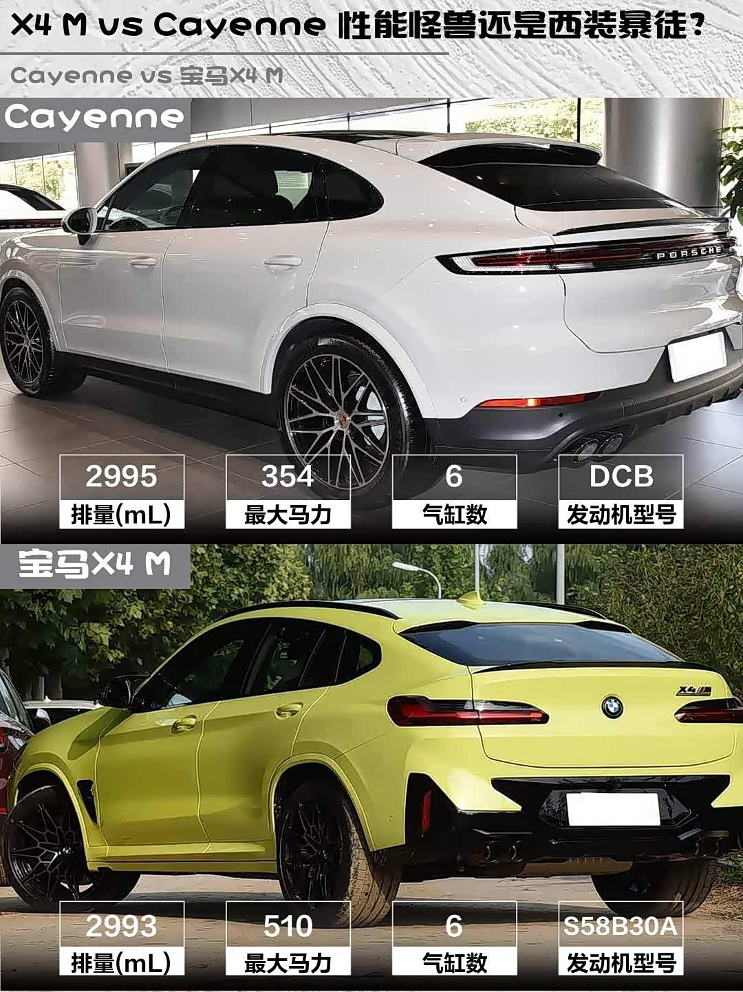 要极致性能选X4 M雷霆版,S58发动机+8AT变速箱的组合堪称性能控的终极解药;要品牌格调+全能表现选Cayenne Coupé,保时捷的盾徽带来的社交属性你懂的~最后提醒:X4 M现车优惠大,Cayenne选配等车周期长,急用车建议直接提现车!