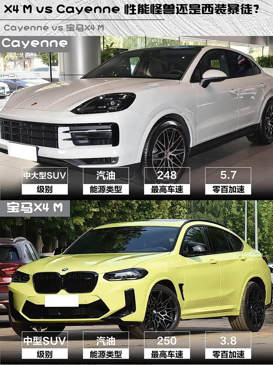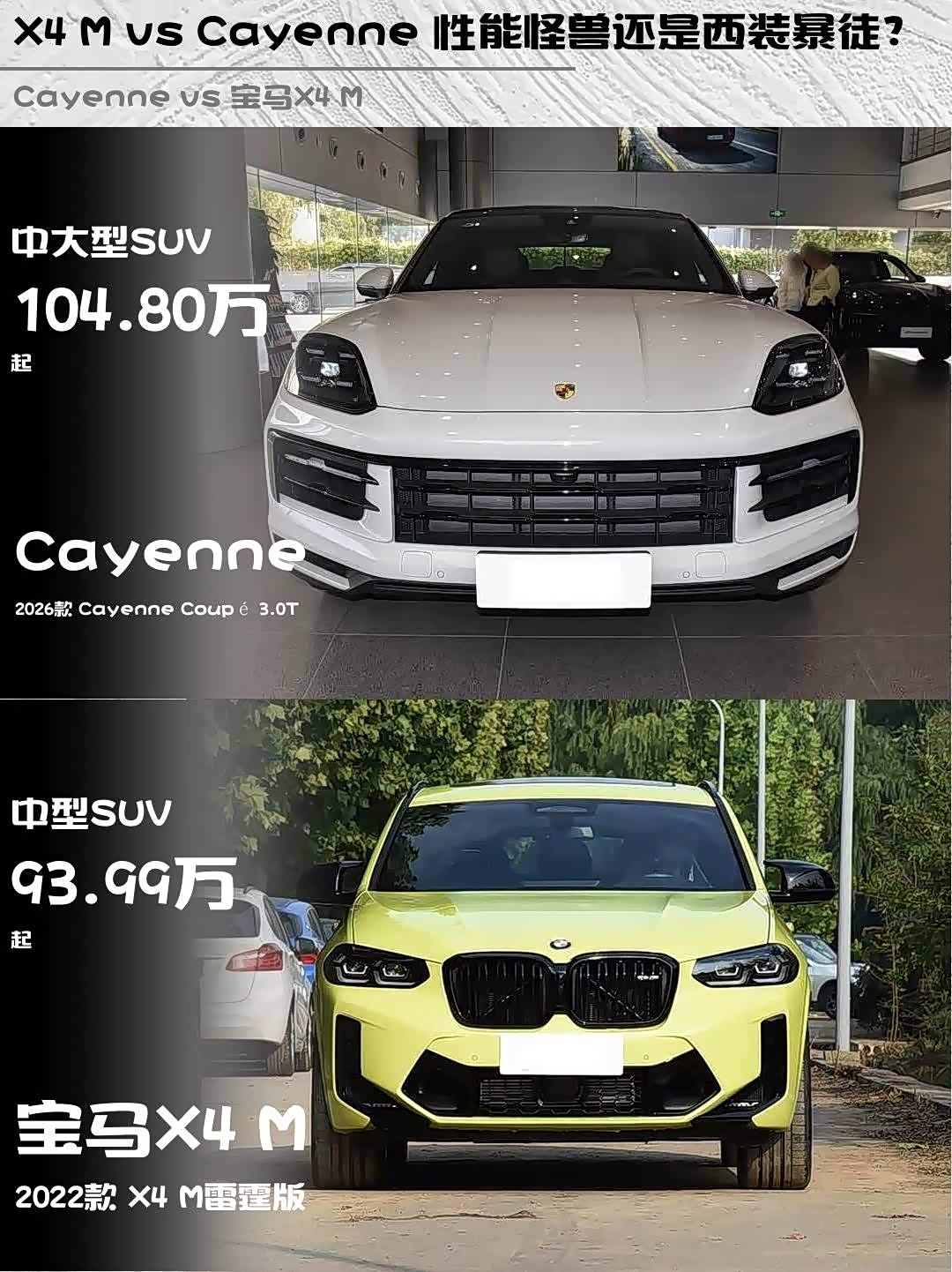 保时捷2026款 Cayenne Coupé 3.0T vs 宝马2022款 X4 M(参数|询价)雷霆版,百万级性能SUV怎么选?今天带大家深度对比这两台猛兽级座驾🔥