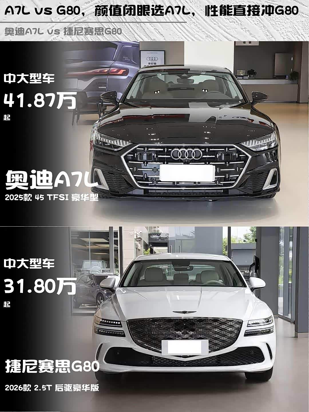 车家号·0浏览·2026-02-24 08:55 · 北京最近试驾了奥迪A7L 2025款 45 TFSI 豪华型和 捷尼赛思G80(参数|询价) 2026款 2.5T 后驱豪华版,两款都是中大型车里的颜值担当,但风格截然不同,纠结选谁的朋友可以看这篇深度对比!💡